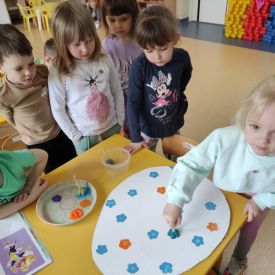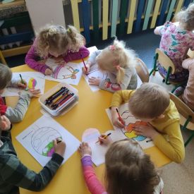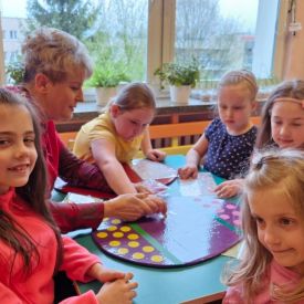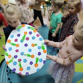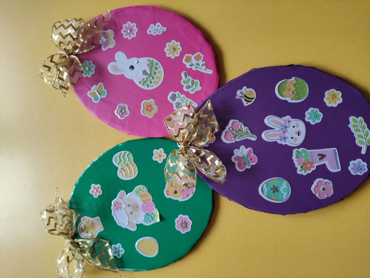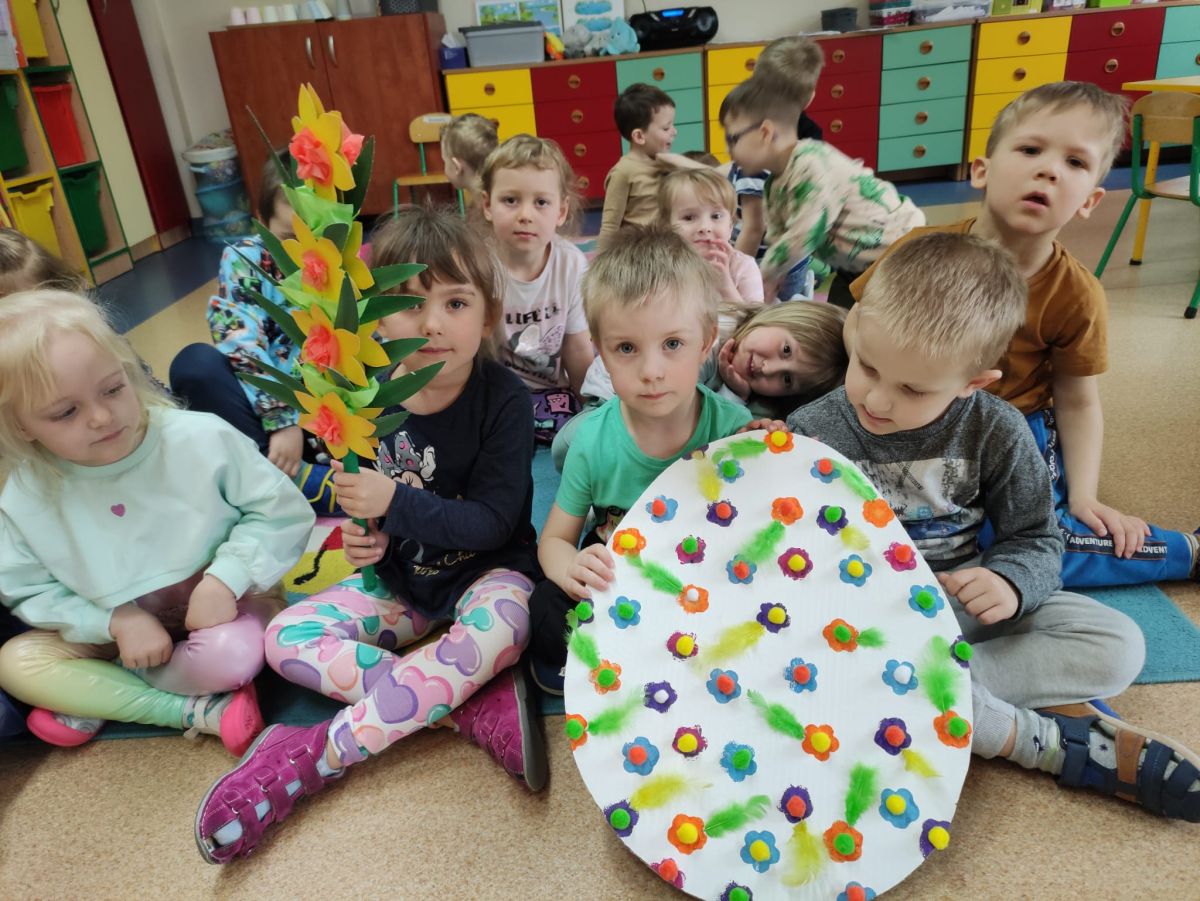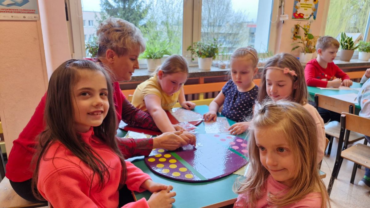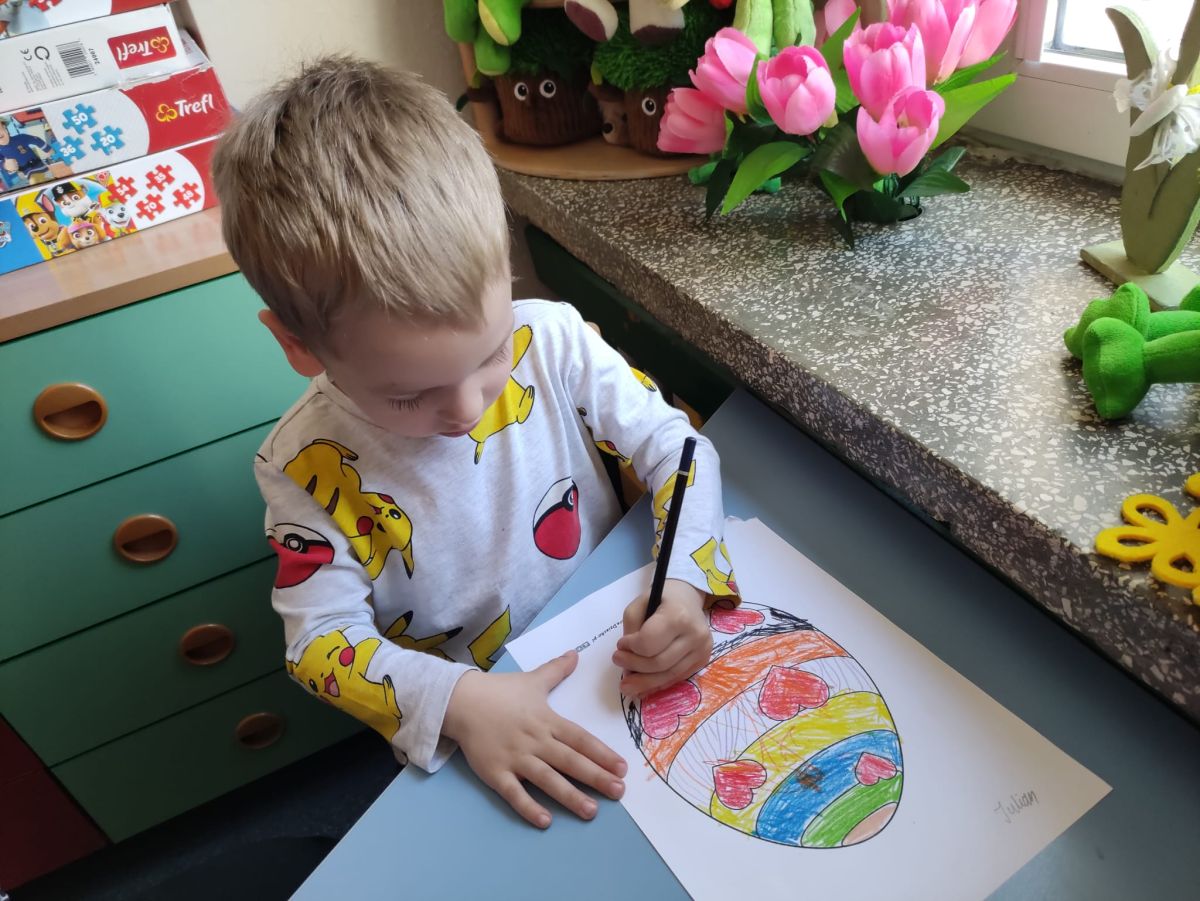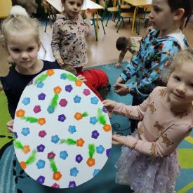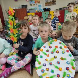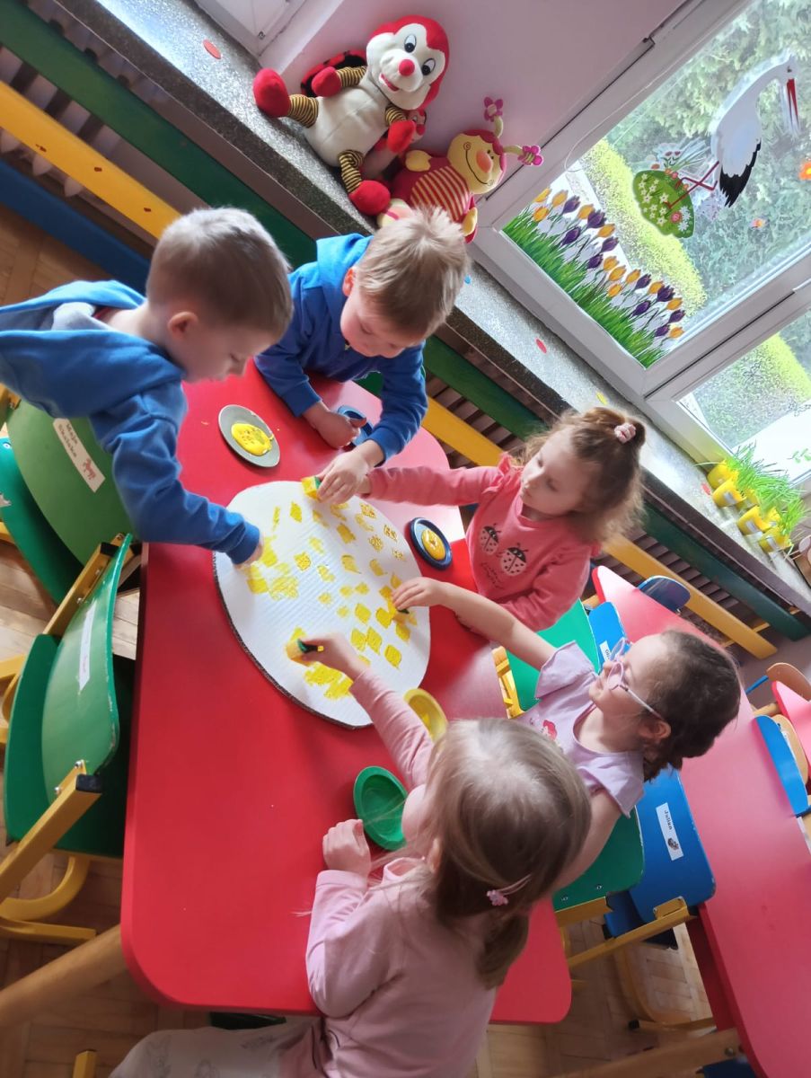 Tuż przed świętami wielkanocnymi panowała w naszym przedszkolu świąteczna atmosfera. Tworzenie palm wielkanocnych, kartek z życzeniami, stroików z rzeżuchy, bukszpanów . Z każdym dniem w naszych salach, holu przedszkolnym przybywało wielkanocnych symboli.