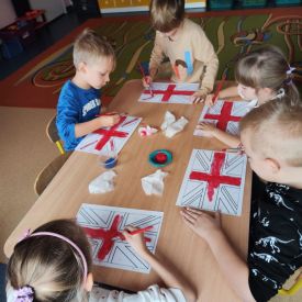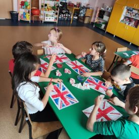 Dzieci w ramach projektu wykonały pierwsze zadanie „Flaga maga” – stworzenie dowolną techniką flagi Wielkiej Brytanii.