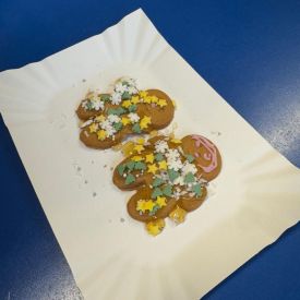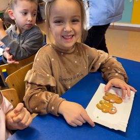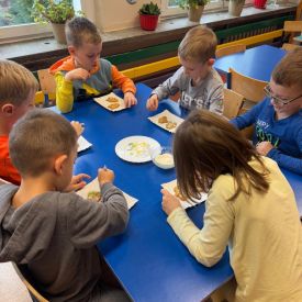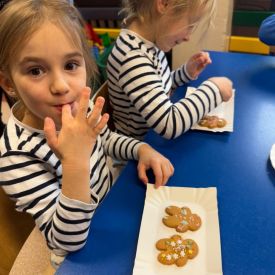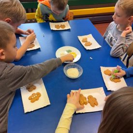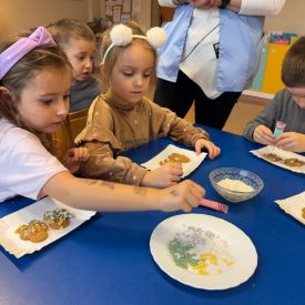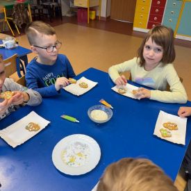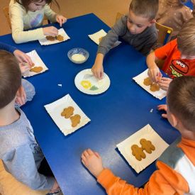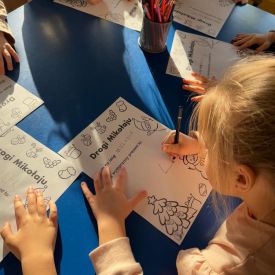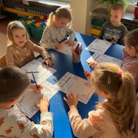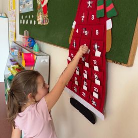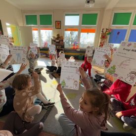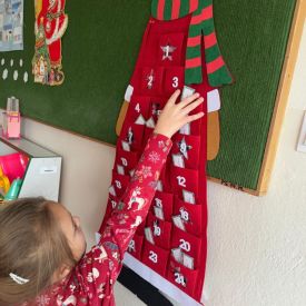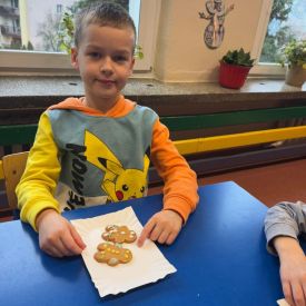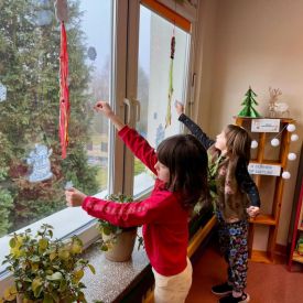 Dzieci z V grupy postanowiły jak najlepiej przygotować się do Świąt Bożego Narodzenia, dlatego codziennie otwierały kalendarz adwentowy. W okienkach kalendarza ukryte były zadania, które dzieci wykonywały wspólnie z całą grupą, na weekendy dzieci dostawały zadania do wykonania w domu. Dzieci wraz z paniami wykonywały ozdoby choinkowe, dekorowały pierniczki, wykonywały kartki dla bliskich, uczyły się i słuchały świątecznych piosenek i pastorałek, robiły dobre uczynki, rozwiązywały zagadki, poznały świąteczne zwyczaje w innych krajach i wiele innych.