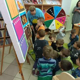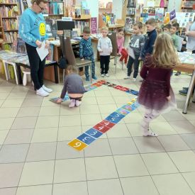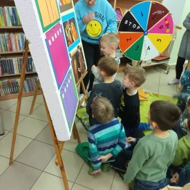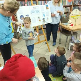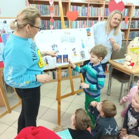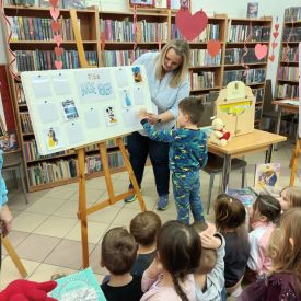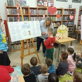Nasi mali odkrywcy Pszczółki i Sówki 13 lutego 2024 r. wyruszyli do biblioteki, gdzie zostali serdecznie przywitani przez nasze wspaniałe Panie bibliotekarki. Podczas zajęć dzieci uczestniczyły w różnorodnych aktywnościach związanych z tematyką Walentynek. Na początku Pani Ewa zaprezentowała bajkę z morałem Roberta Kuśty „Zakochana para”, w formie teatrzyku Kamishibai. Odgadywanie baśniowych par przy pomocy koła fortuny i kostek do gry oraz bajkowe memory okazały się idealnym sprawdzianem wiedzy uczestników. Do stworzenia atmosfery współzawodnictwa posłużyło domino – gra, która oprócz znakomitej rozrywki stanowi doskonałą formę edukacyjną dla dzieci polegającą na ćwiczeniu cierpliwości, skupienia, spostrzegawczości, pamięci i strategicznego myślenia. Zwieńczeniem spotkania było otrzymanie od Pań „zakochanych” zakładek z bajkowymi elementami do pokolorowania w domu.