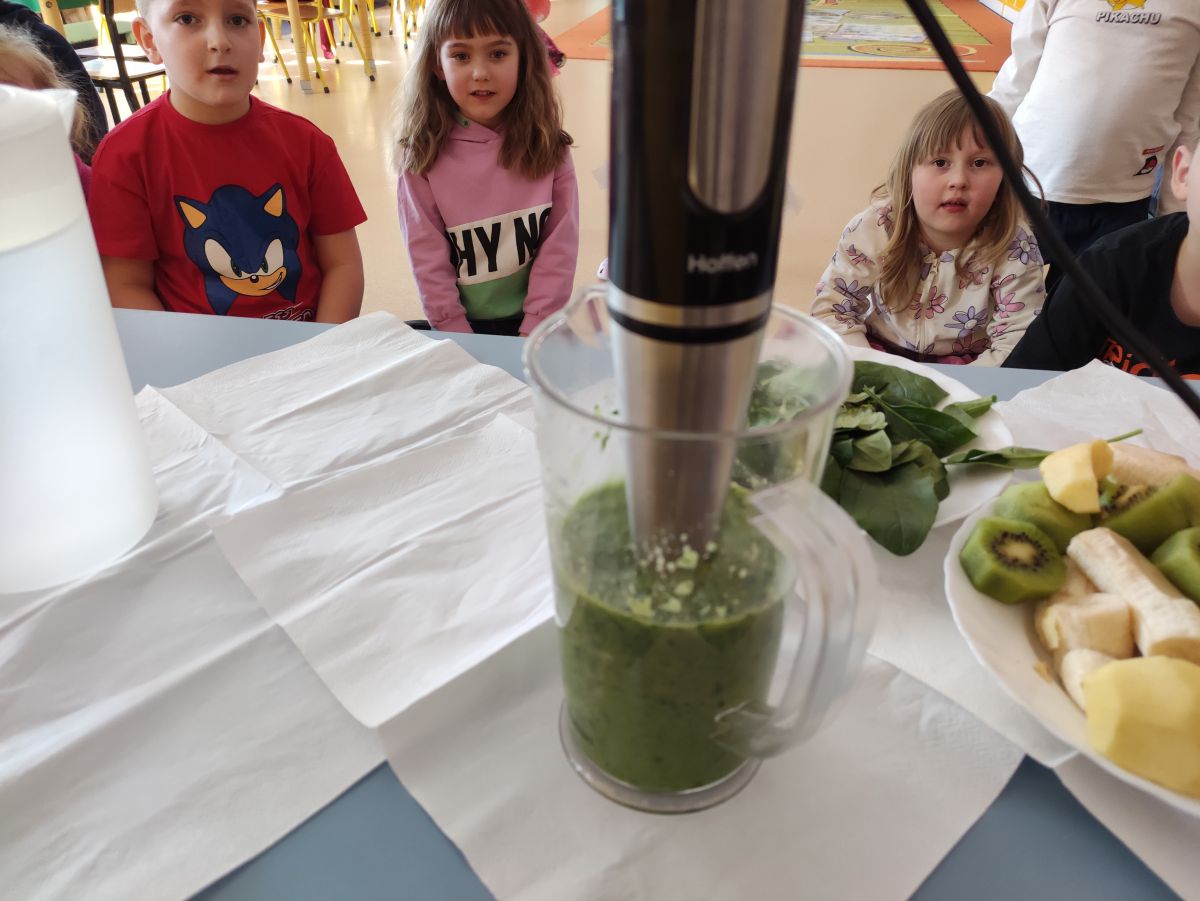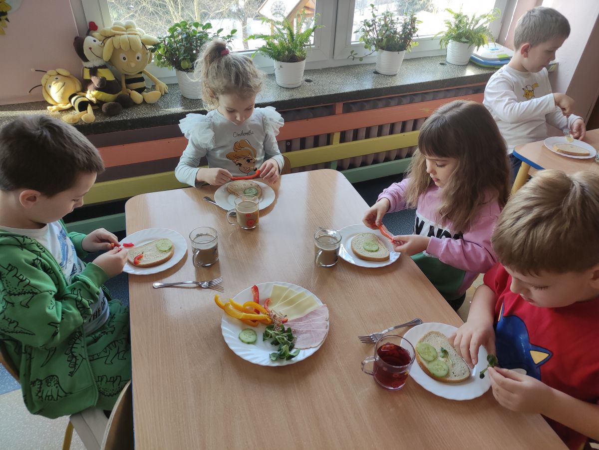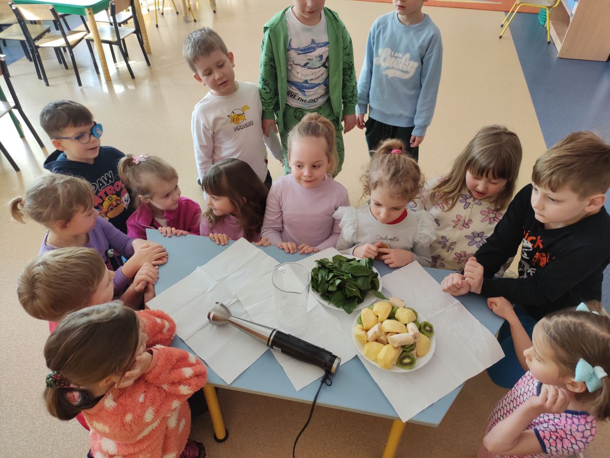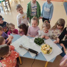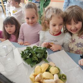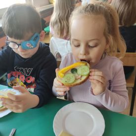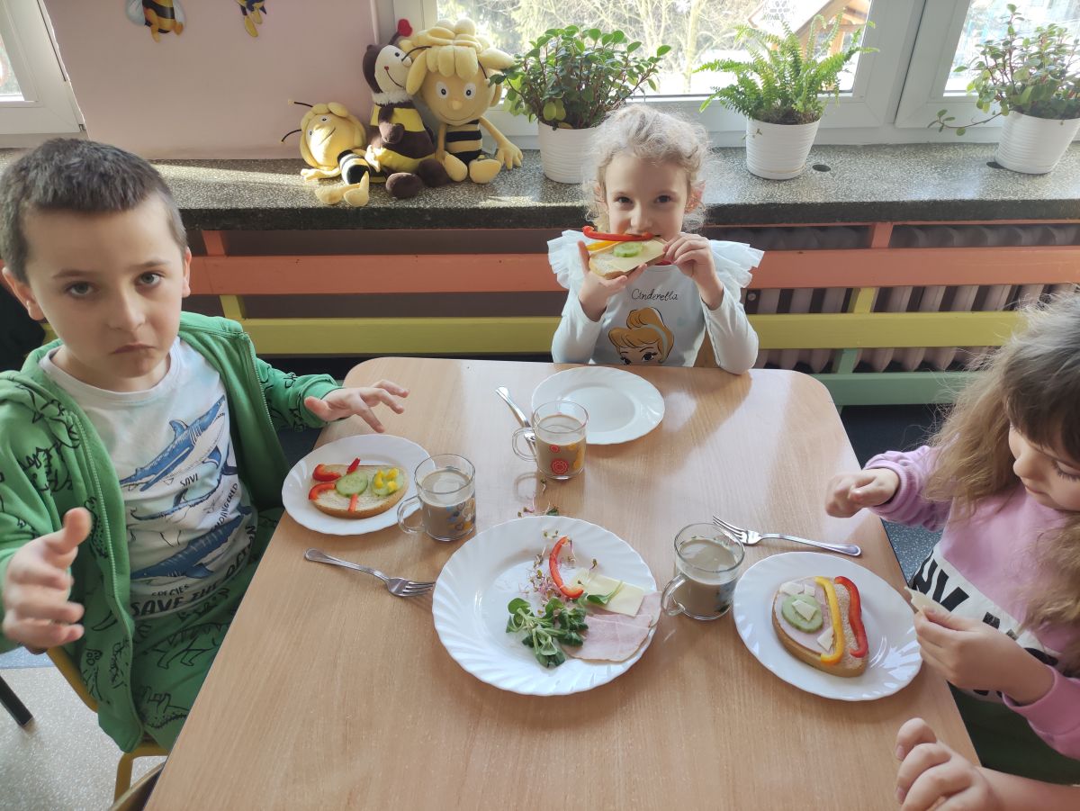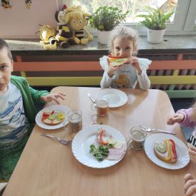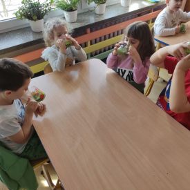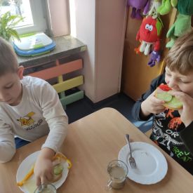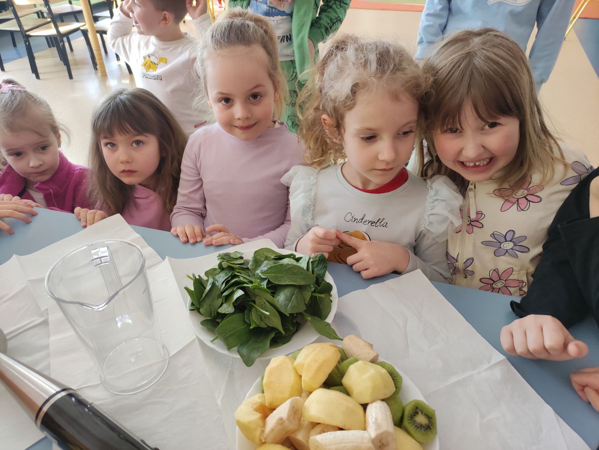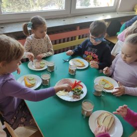 Przedszkolaki z grupy Pszczółek zrealizowały kolejne zadania z ogólnopolskiego projektu edukacyjnego "Postaw na wartości" zawarte w Kręgu IV - "Postaw na zdrowie". Dzieci wiedzą, że trzeba dbać o higienę osobistą, bo bakterie i wirusy robią dla zdrowia psikusy, a gdy ręce czyste - zdrowie oczywiste. Przedszkolaki pewnego dnia przygotowywały sobie samodzielnie śniadanie oraz zielony koktajl, który wszyscy wypili ze smakiem zaś samodzielnie wykonane kanapki były kolorowe i smaczne. Dzieci pamiętają, że gdy na talerzu kolorowo, to dla ciała zdrowo, a warzywa i owoce mają supermoce! Po zdrowym porannym posiłku przyszedł czas na gimnastykę, zabawy przy muzyce oraz pobyt na świeżym powietrzu w myśl zasad: w zdrowym śniadaniu - siła w działaniu, śmiech i zabawa- to zdrowia podstawa. Pszczółki obiecały, że będą pamiętać o powyższych zasadach, gdyż każdy chce być zdrowy!