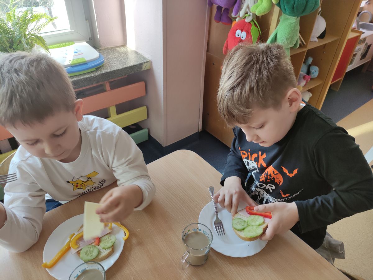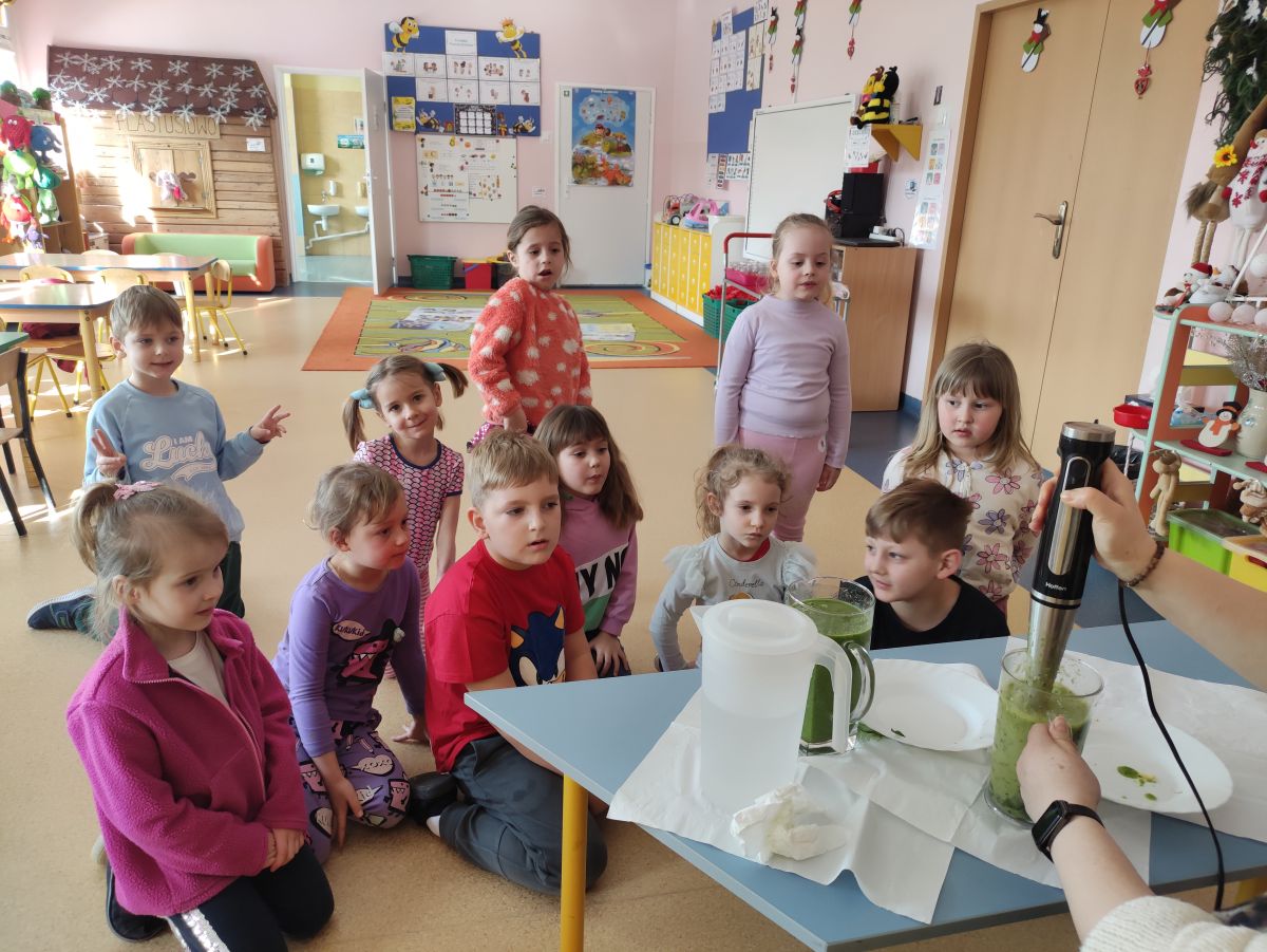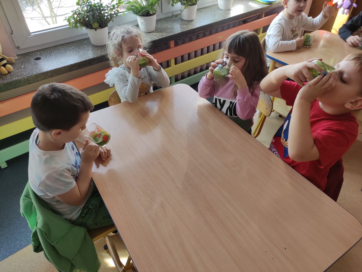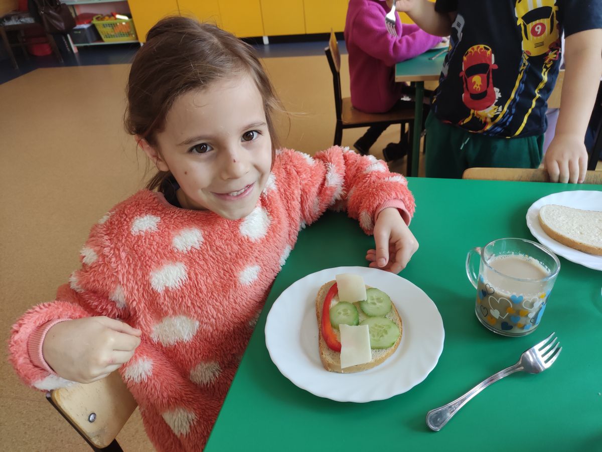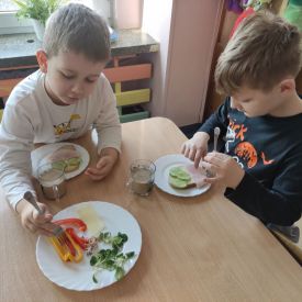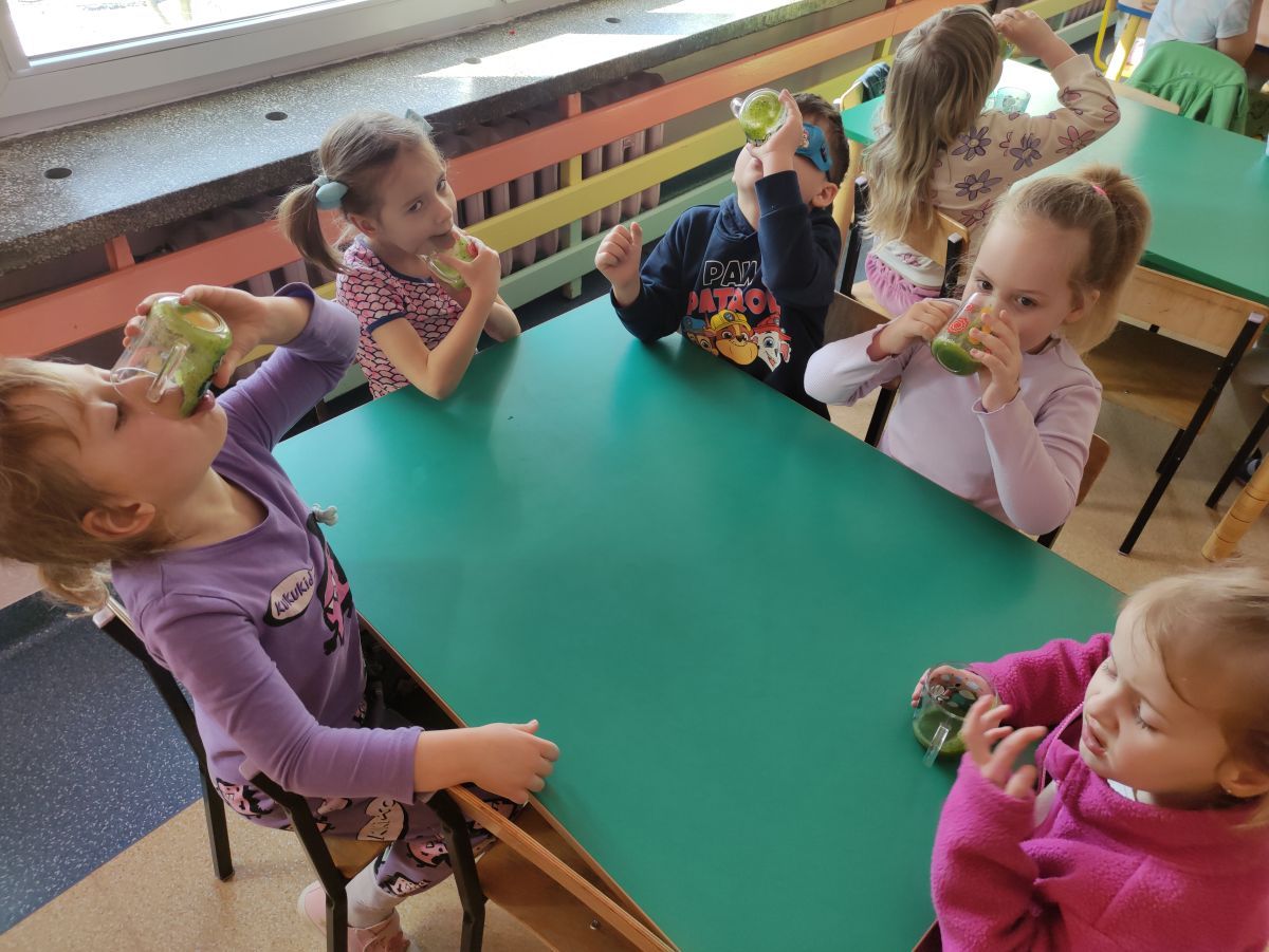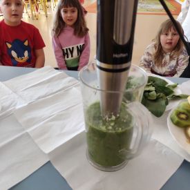 Przedszkolaki z grupy Pszczółek zrealizowały kolejne zadania z ogólnopolskiego projektu edukacyjnego "Postaw na wartości" zawarte w Kręgu IV - "Postaw na zdrowie". Dzieci wiedzą, że trzeba dbać o higienę osobistą, bo bakterie i wirusy robią dla zdrowia psikusy, a gdy ręce czyste - zdrowie oczywiste. Przedszkolaki pewnego dnia przygotowywały sobie samodzielnie śniadanie oraz zielony koktajl, który wszyscy wypili ze smakiem zaś samodzielnie wykonane kanapki były kolorowe i smaczne. Dzieci pamiętają, że gdy na talerzu kolorowo, to dla ciała zdrowo, a warzywa i owoce mają supermoce! Po zdrowym porannym posiłku przyszedł czas na gimnastykę, zabawy przy muzyce oraz pobyt na świeżym powietrzu w myśl zasad: w zdrowym śniadaniu - siła w działaniu, śmiech i zabawa- to zdrowia podstawa. Pszczółki obiecały, że będą pamiętać o powyższych zasadach, gdyż każdy chce być zdrowy!