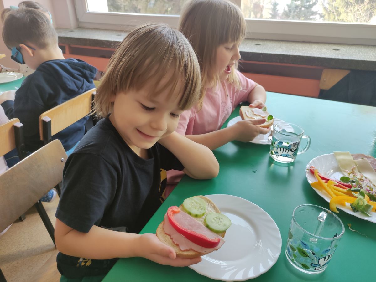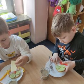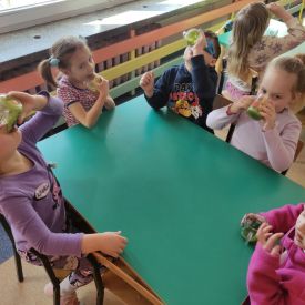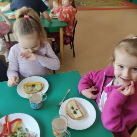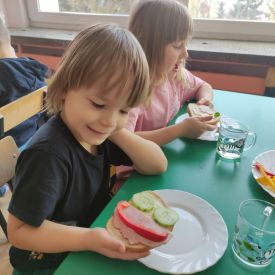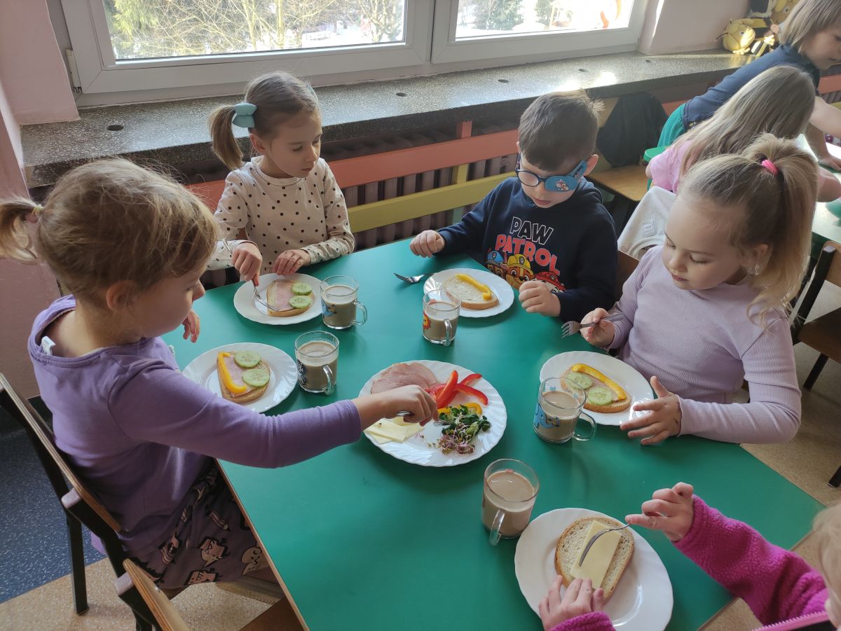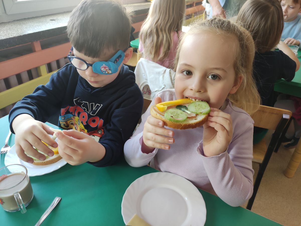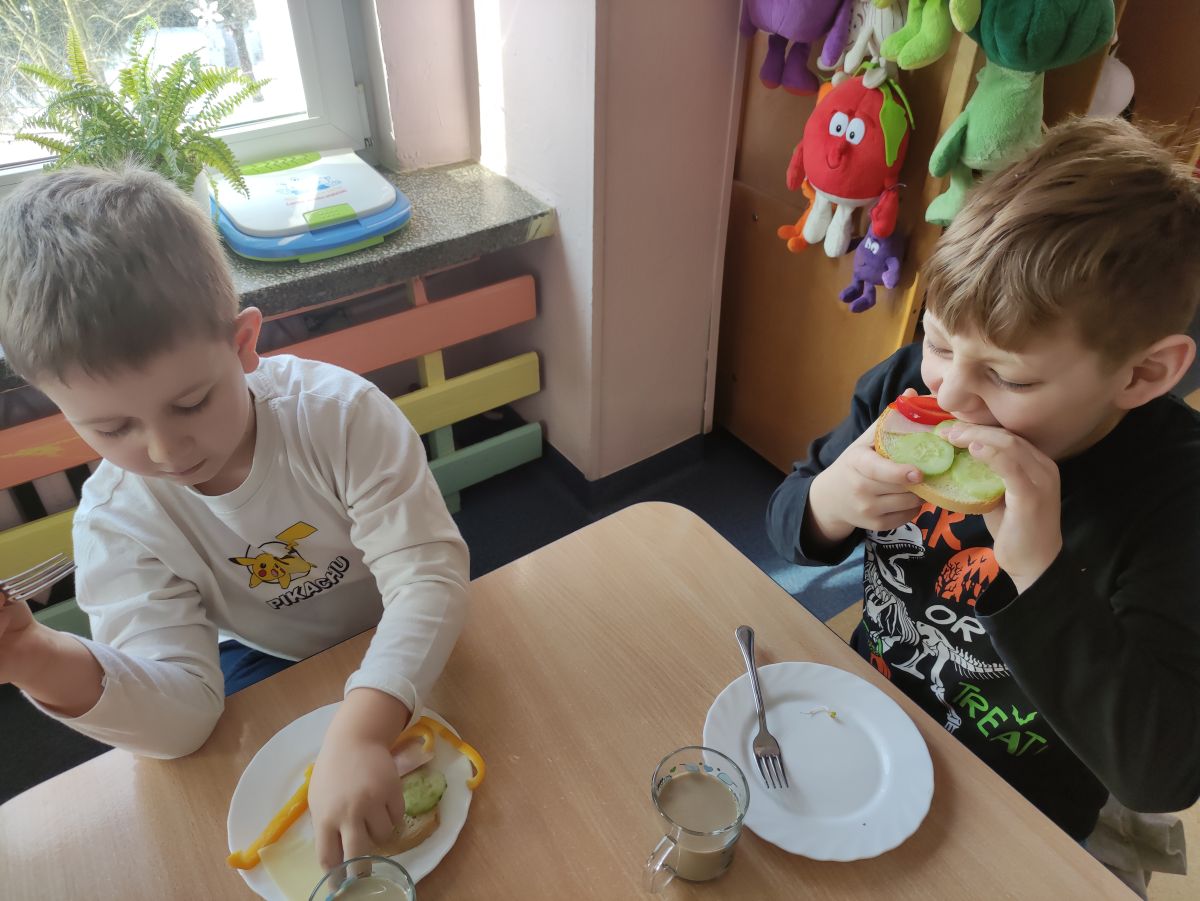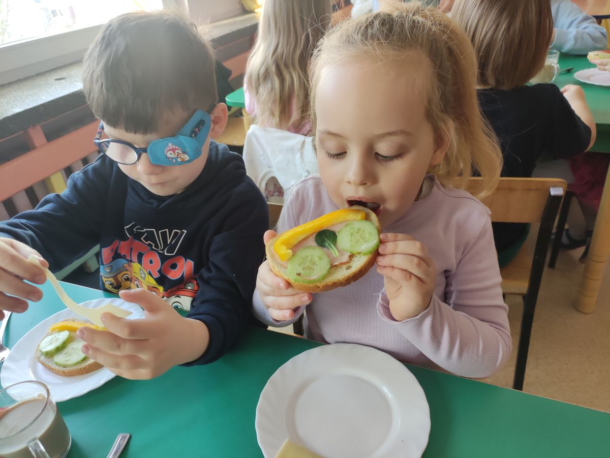 Przedszkolaki z grupy Pszczółek zrealizowały kolejne zadania z ogólnopolskiego projektu edukacyjnego "Postaw na wartości" zawarte w Kręgu IV - "Postaw na zdrowie". Dzieci wiedzą, że trzeba dbać o higienę osobistą, bo bakterie i wirusy robią dla zdrowia psikusy, a gdy ręce czyste - zdrowie oczywiste. Przedszkolaki pewnego dnia przygotowywały sobie samodzielnie śniadanie oraz zielony koktajl, który wszyscy wypili ze smakiem zaś samodzielnie wykonane kanapki były kolorowe i smaczne. Dzieci pamiętają, że gdy na talerzu kolorowo, to dla ciała zdrowo, a warzywa i owoce mają supermoce! Po zdrowym porannym posiłku przyszedł czas na gimnastykę, zabawy przy muzyce oraz pobyt na świeżym powietrzu w myśl zasad: w zdrowym śniadaniu - siła w działaniu, śmiech i zabawa- to zdrowia podstawa. Pszczółki obiecały, że będą pamiętać o powyższych zasadach, gdyż każdy chce być zdrowy!