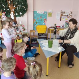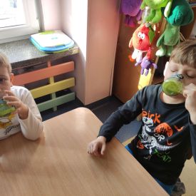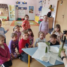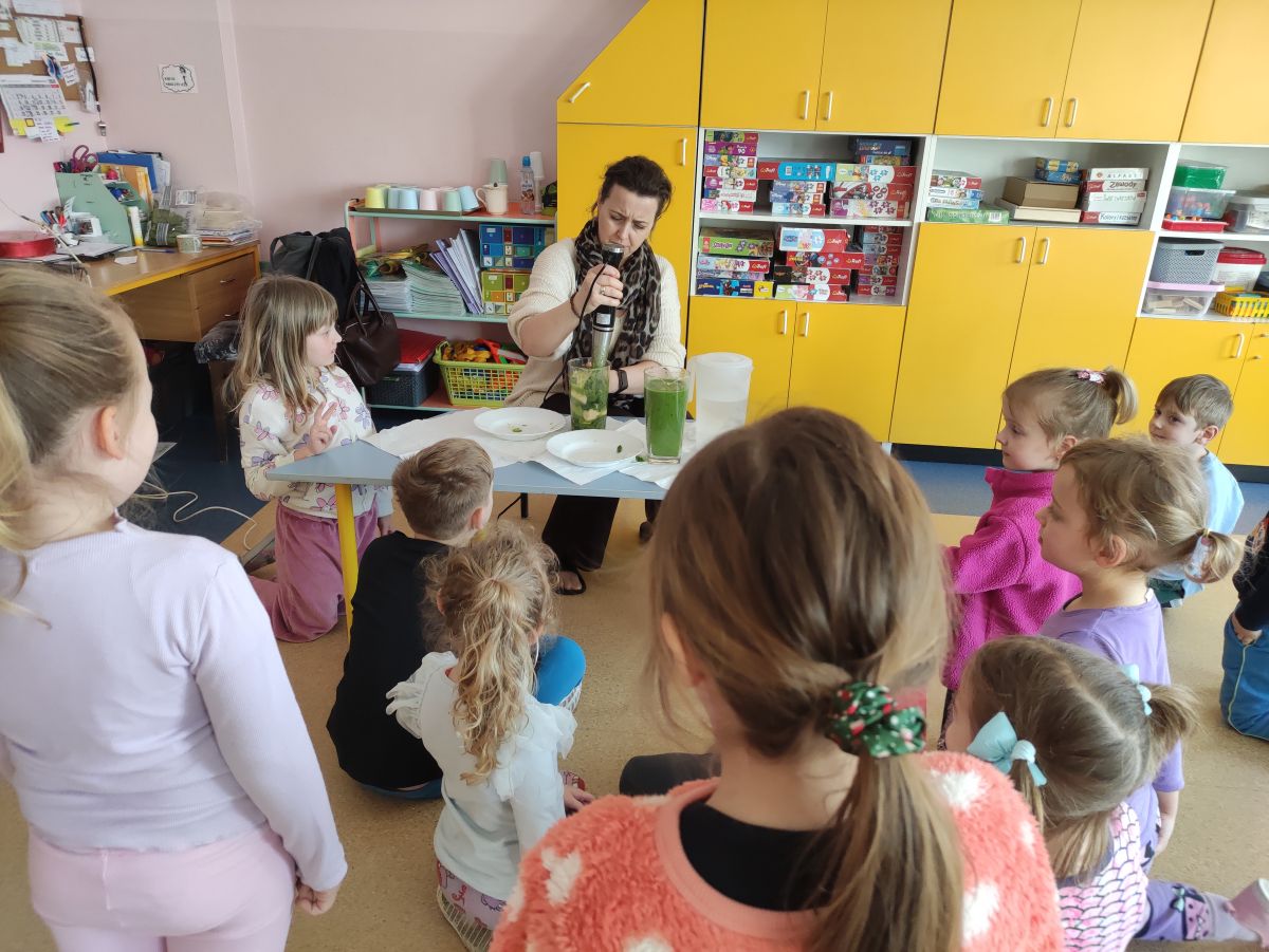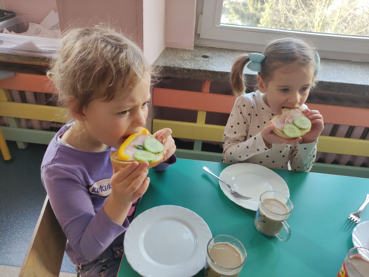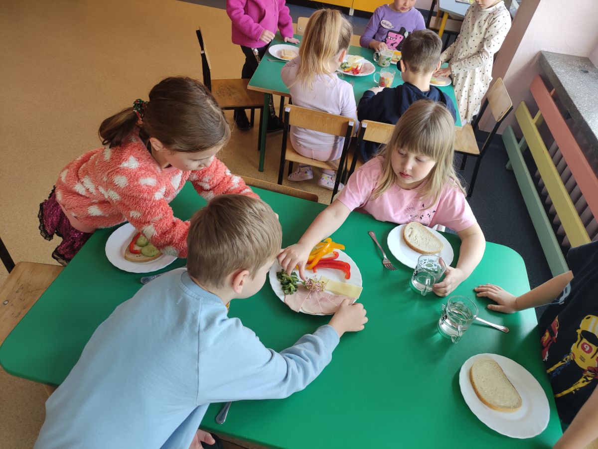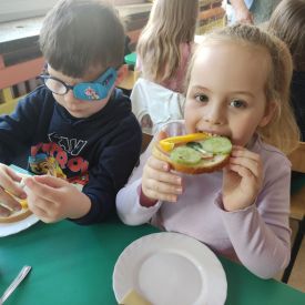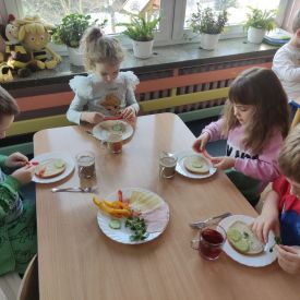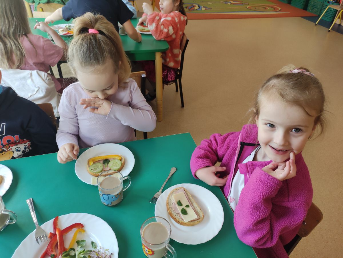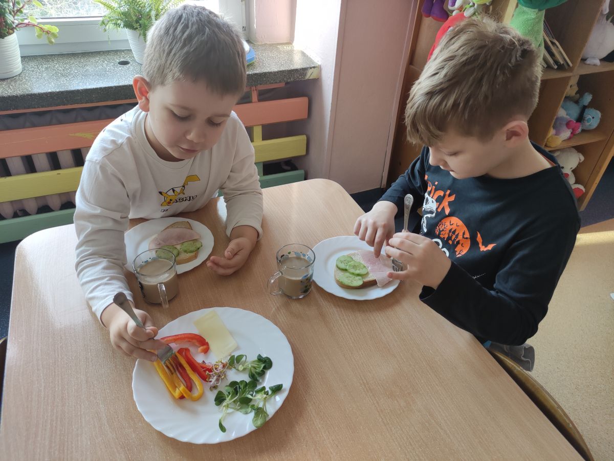 Przedszkolaki z grupy Pszczółek zrealizowały kolejne zadania z ogólnopolskiego projektu edukacyjnego "Postaw na wartości" zawarte w Kręgu IV - "Postaw na zdrowie". Dzieci wiedzą, że trzeba dbać o higienę osobistą, bo bakterie i wirusy robią dla zdrowia psikusy, a gdy ręce czyste - zdrowie oczywiste. Przedszkolaki pewnego dnia przygotowywały sobie samodzielnie śniadanie oraz zielony koktajl, który wszyscy wypili ze smakiem zaś samodzielnie wykonane kanapki były kolorowe i smaczne. Dzieci pamiętają, że gdy na talerzu kolorowo, to dla ciała zdrowo, a warzywa i owoce mają supermoce! Po zdrowym porannym posiłku przyszedł czas na gimnastykę, zabawy przy muzyce oraz pobyt na świeżym powietrzu w myśl zasad: w zdrowym śniadaniu - siła w działaniu, śmiech i zabawa- to zdrowia podstawa. Pszczółki obiecały, że będą pamiętać o powyższych zasadach, gdyż każdy chce być zdrowy!