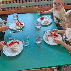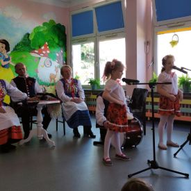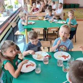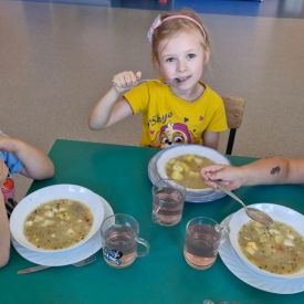 Po występie czekał na wszystkich obiad przygotowany przez panie kucharki. Dzieci zakosztowały regionalnych potraw: zalewajki świętokrzyskiej, pierogów i ciasta drożdżowego. Było smacznie, barwnie, gwarnie i wesoło – było pięknie. W ten sposób przedszkolaki poznały tradycje świętokrzyskie: gwarę, strój , kuchnie, muzykę i obyczaje.
