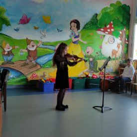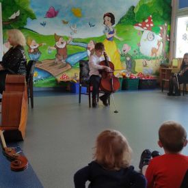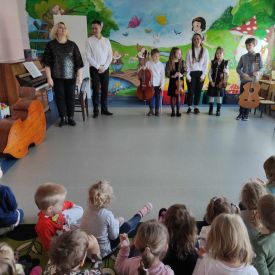 Tuż po feriach na przedszkolaków czekała niespodzianka w postaci koncertu muzycznego w wykonaniu uczniów Zespołu Państwowych Szkół Muzycznych im. Ludomira Różyckiego w Kielcach. Młodzi muzycy wraz ze swoimi nauczycielami przybyli na zaproszenie naszej Pani dyrektor. Dzieci na żywo mogły zobaczyć i posłuchać utworów wykonywanych na altówce, skrzypcach, kontrabasie, wiolonczeli oraz na gitarze. Dziękujemy naszym gościom za wyjątkowy występ.