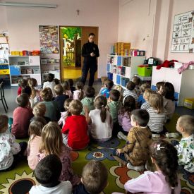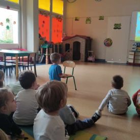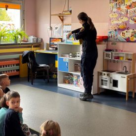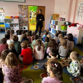 Dnia 27 listopada 2024r. nasze przedszkole odwiedził pracownik Straży Miejskiej. W spotkaniu uczestniczyły wszystkie przedszkolaki. Pani strażnik poprowadziła pogadankę na temat segregowania śmieci oraz dbania o środowisko. Gość opowiedział dzieciom na czym polega praca strażnika miejskiego oraz omówił elementy swojego munduru. Dzięki spotkaniu dzieci wzbogaciły swoją wiedzę o znajomość numeru do Straży Miejskiej - 986.
