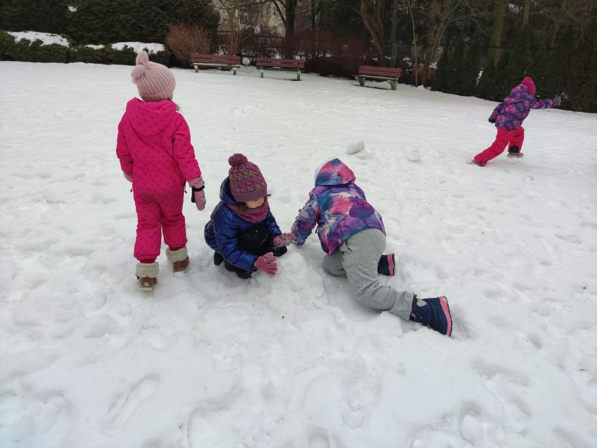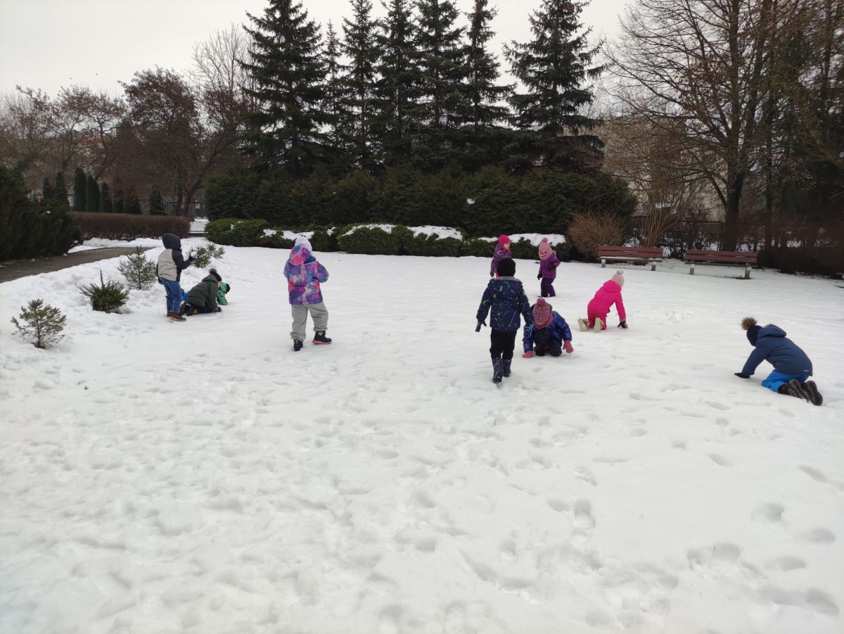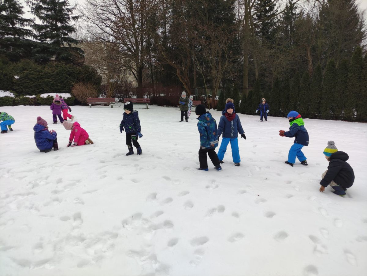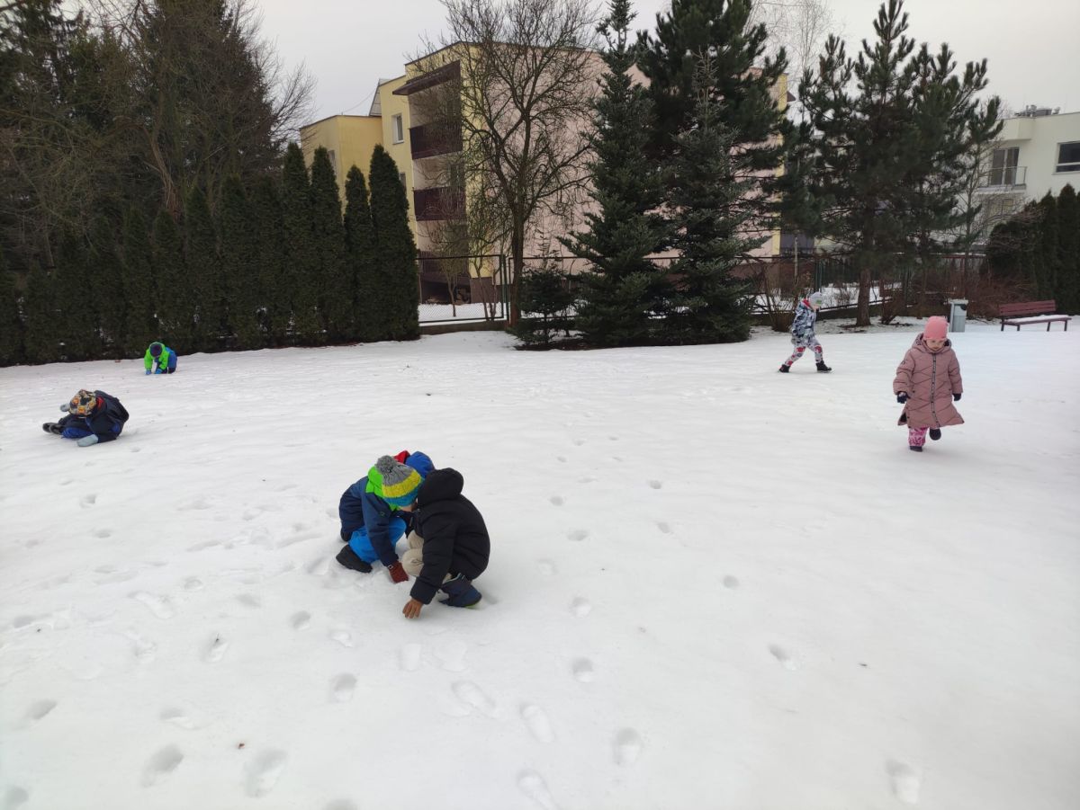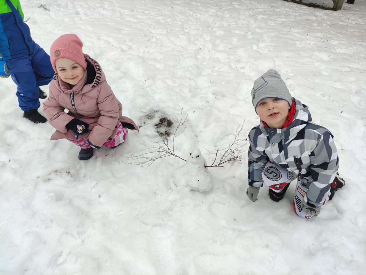 Podczas ferii zimowych przedszkolaki z wielką radością brały udział w zabawach na śniegu w ogrodzie przedszkolnym. Przed wyjęciem nauczycielka przypomniała dzieciom zasady bezpiecznego zachowania na śniegu. Przedszkolakom dużo frajdy sprawiło rzucanie śnieżkami do celu, poszukiwanie śladów zwierząt, ptaków na śniegu, odbijanie aniołków/orzełków. Największą atrakcją cieszył się mini konkurs na śniegowego stworka. Dzieci samodzielnie lub w zespołach lepiły śnieżne figury. Za kreatywność, aktywne uczestnictwo w mini konkursie przedszkolaki zostały nagrodzone drobnymi upominkami.