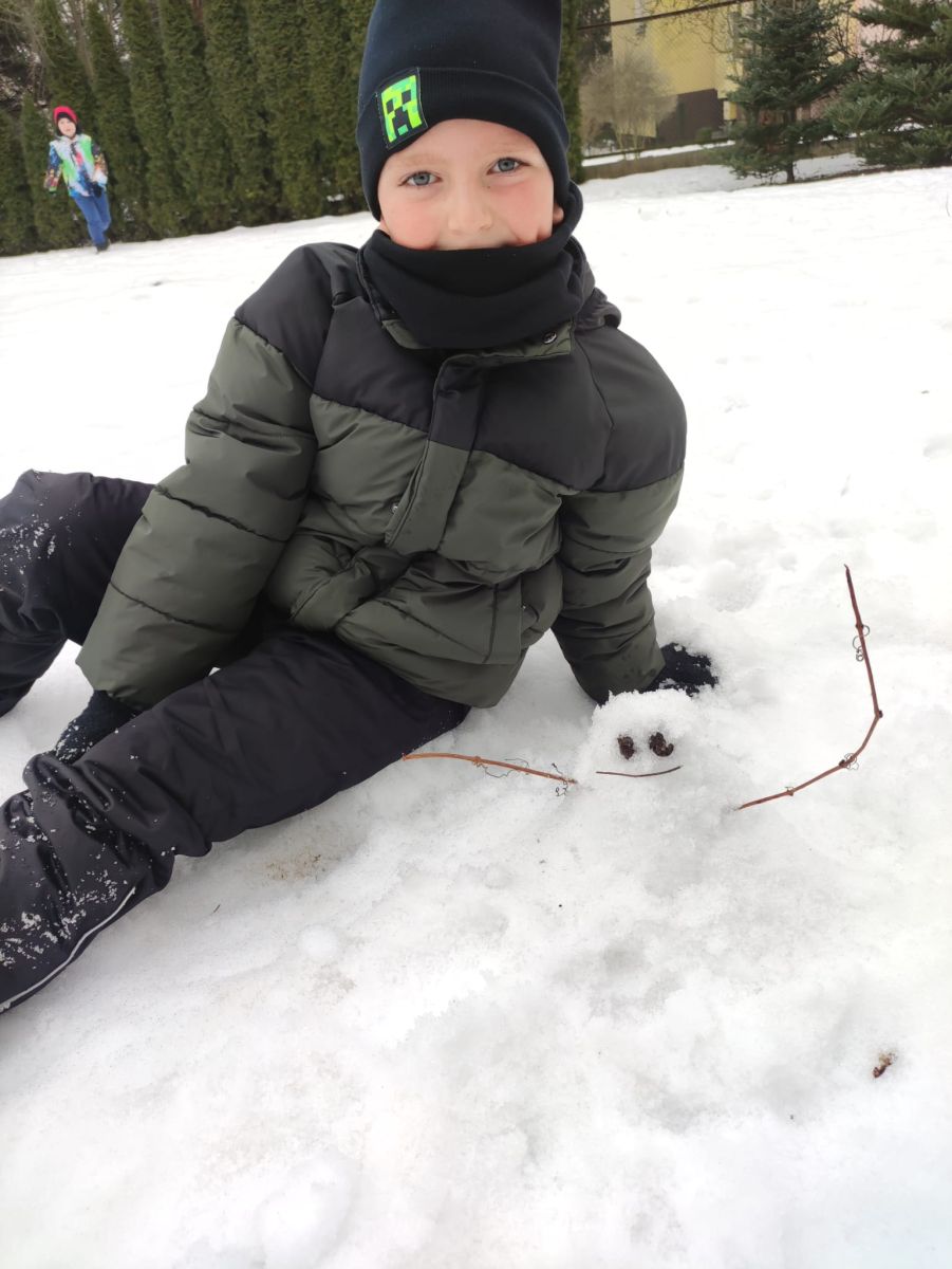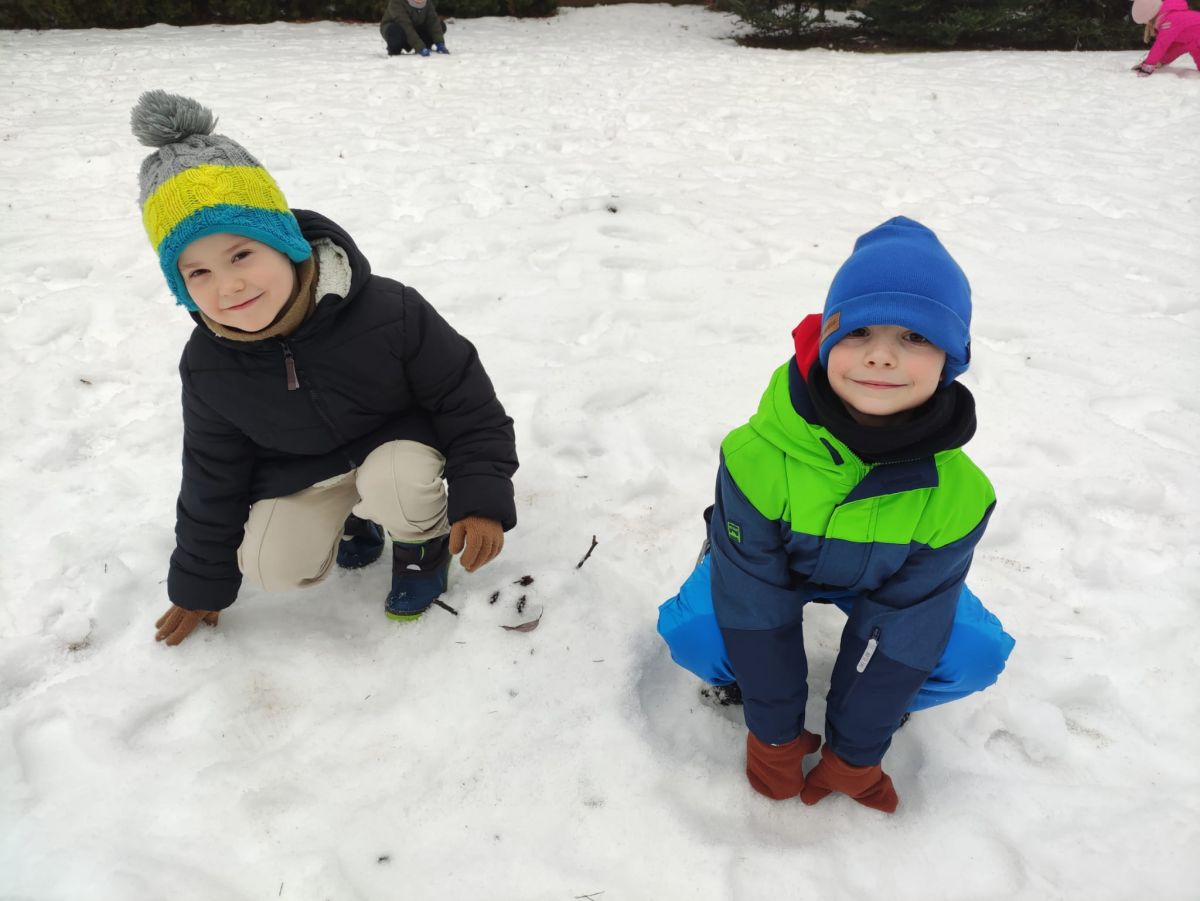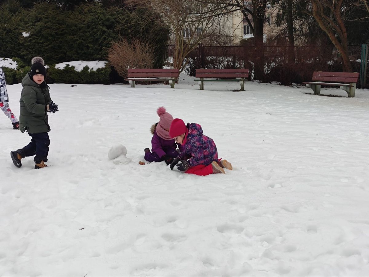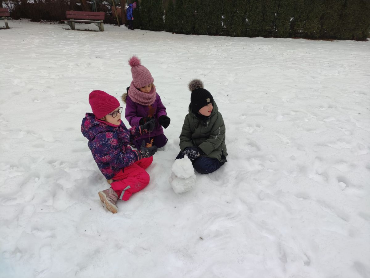Podczas ferii zimowych przedszkolaki z wielką radością brały udział w zabawach na śniegu w ogrodzie przedszkolnym. Przed wyjęciem nauczycielka przypomniała dzieciom zasady bezpiecznego zachowania na śniegu. Przedszkolakom dużo frajdy sprawiło rzucanie śnieżkami do celu, poszukiwanie śladów zwierząt, ptaków na śniegu, odbijanie aniołków/orzełków. Największą atrakcją cieszył się mini konkurs na śniegowego stworka. Dzieci samodzielnie lub w zespołach lepiły śnieżne figury. Za kreatywność, aktywne uczestnictwo w mini konkursie przedszkolaki zostały nagrodzone drobnymi upominkami.