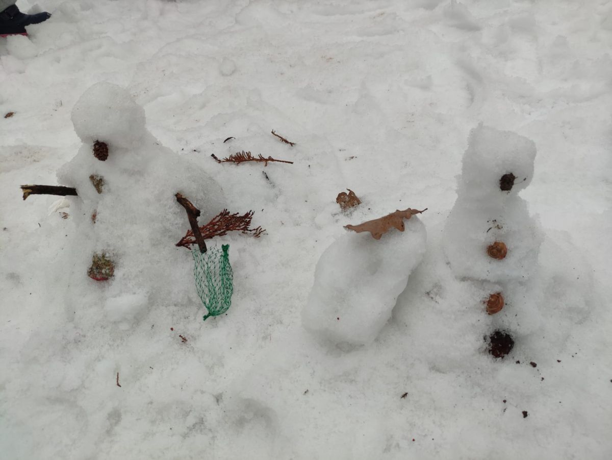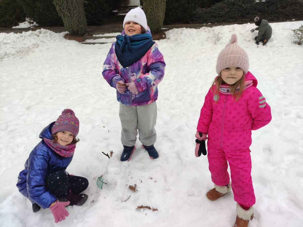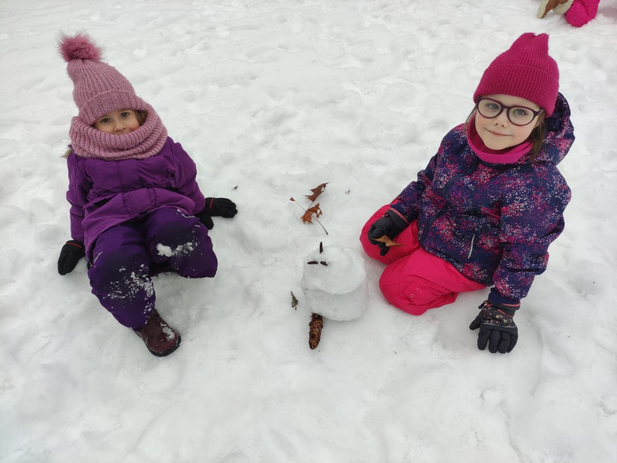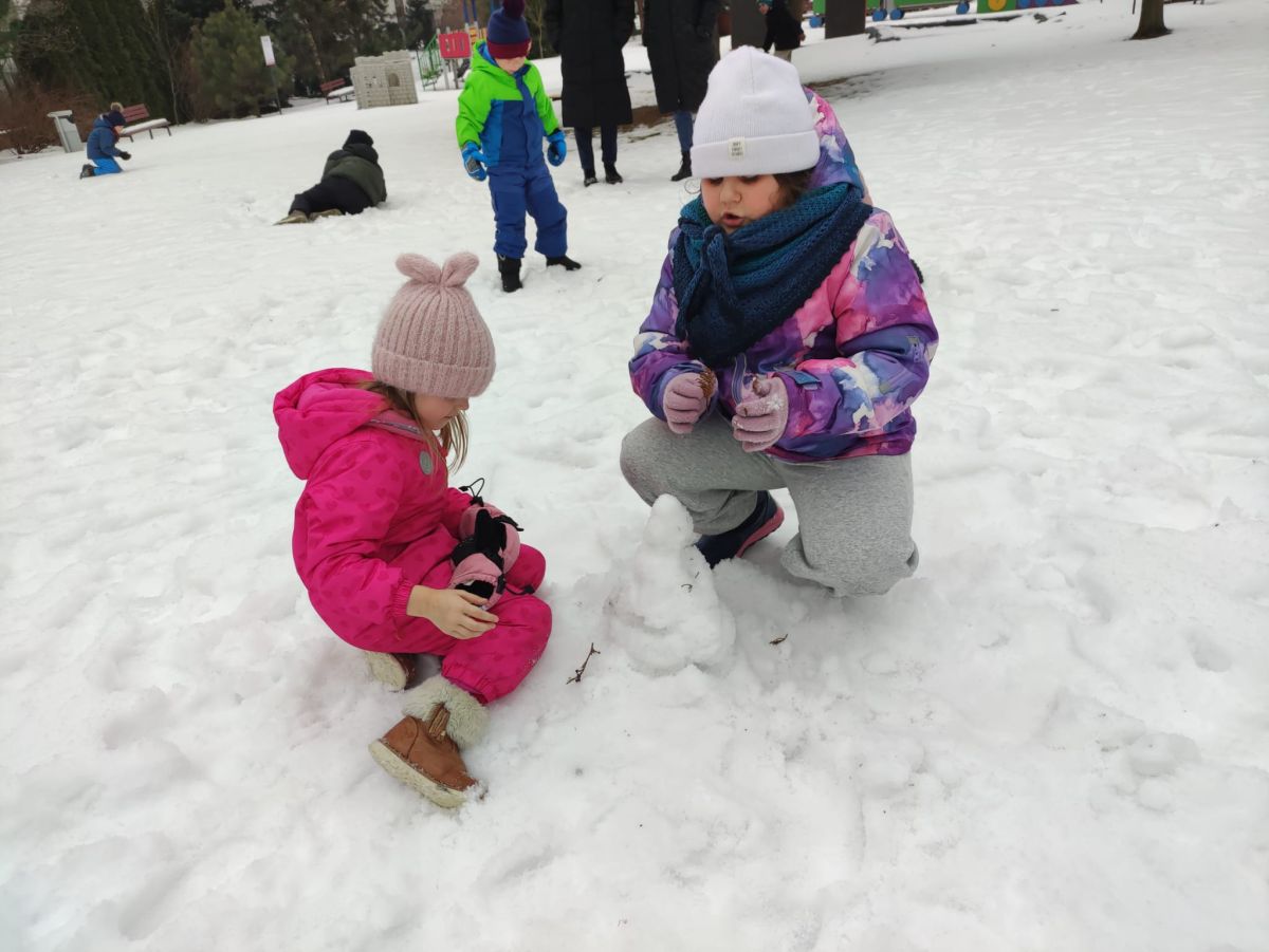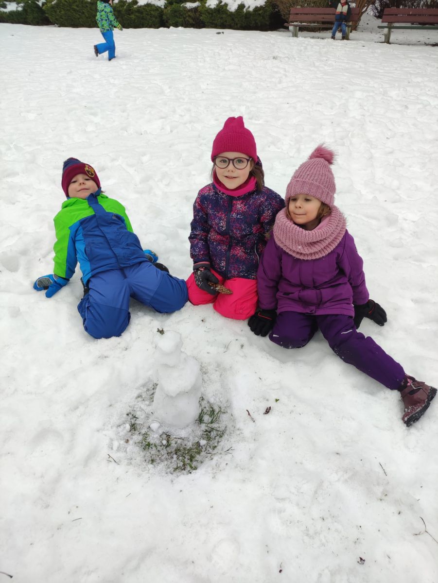 Podczas ferii zimowych przedszkolaki z wielką radością brały udział w zabawach na śniegu w ogrodzie przedszkolnym. Przed wyjęciem nauczycielka przypomniała dzieciom zasady bezpiecznego zachowania na śniegu. Przedszkolakom dużo frajdy sprawiło rzucanie śnieżkami do celu, poszukiwanie śladów zwierząt, ptaków na śniegu, odbijanie aniołków/orzełków. Największą atrakcją cieszył się mini konkurs na śniegowego stworka. Dzieci samodzielnie lub w zespołach lepiły śnieżne figury. Za kreatywność, aktywne uczestnictwo w mini konkursie przedszkolaki zostały nagrodzone drobnymi upominkami.
