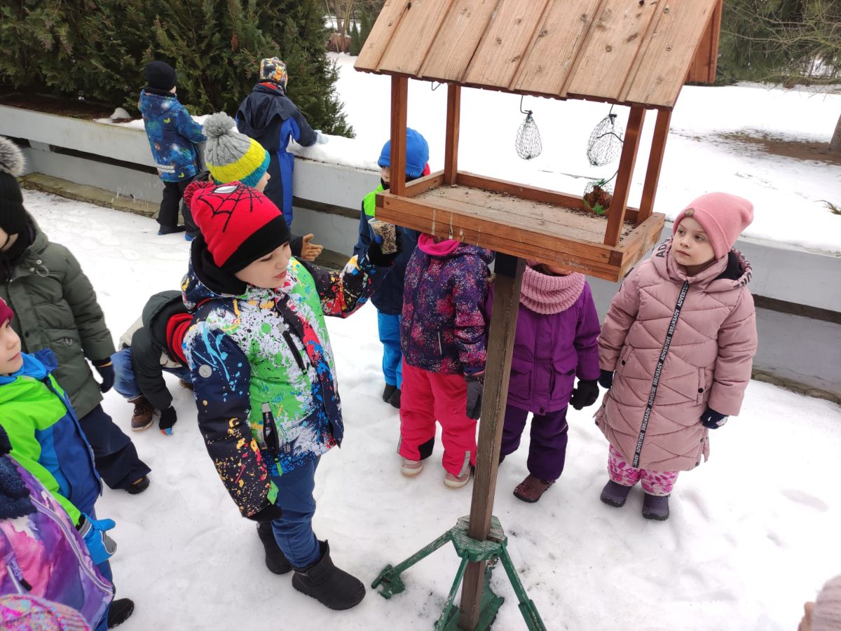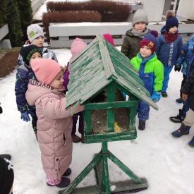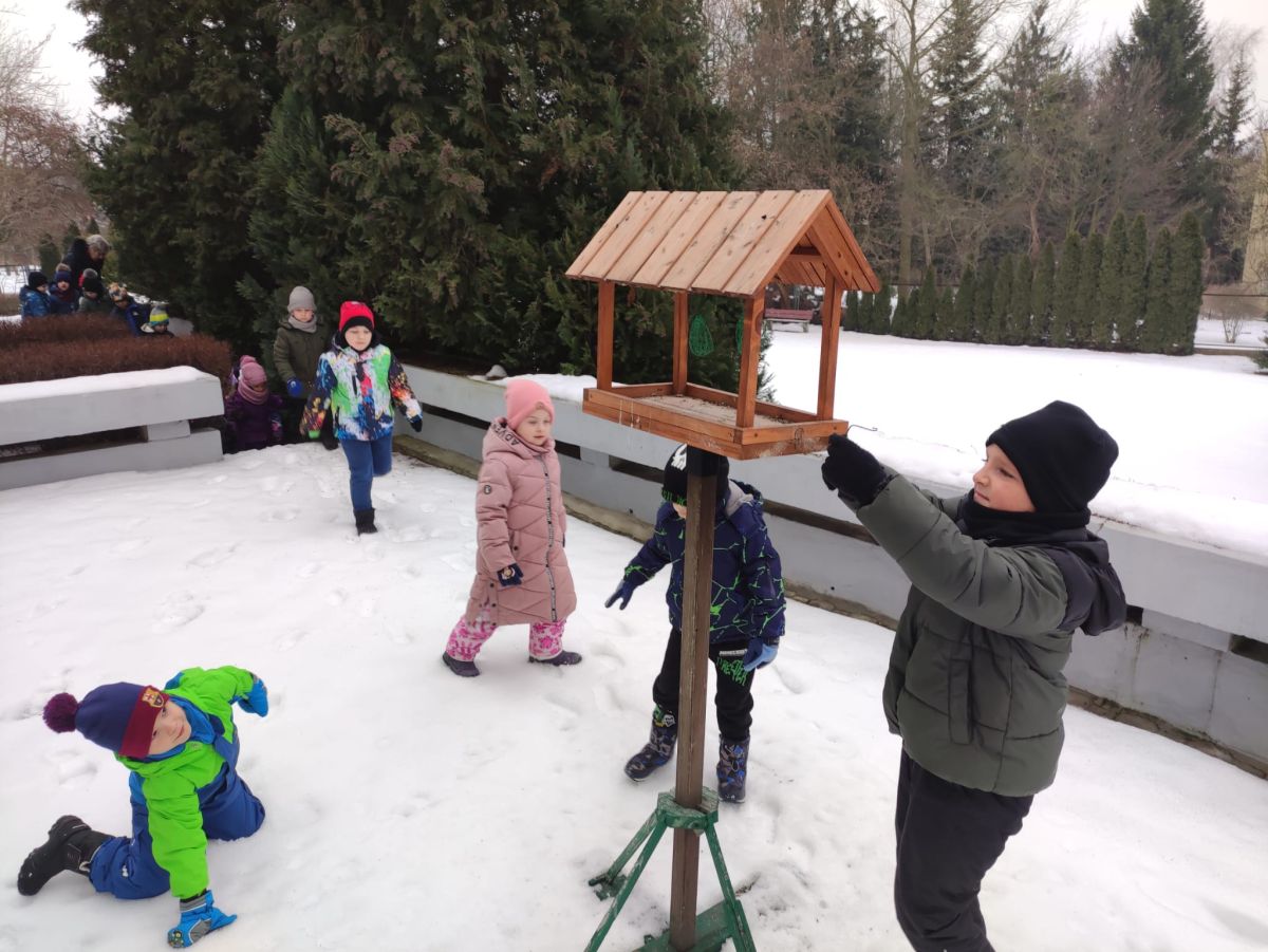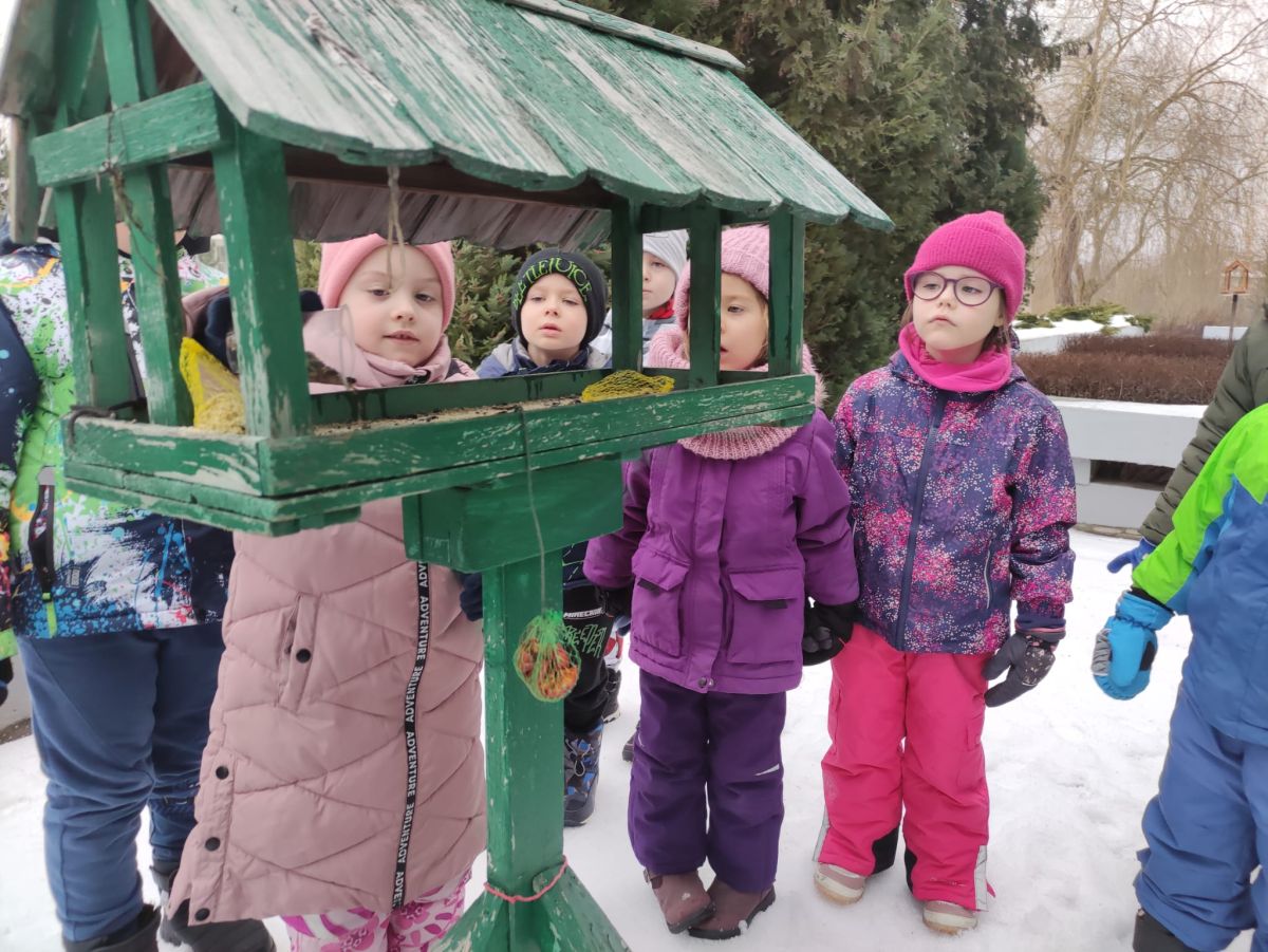Na zakończenie pobytu na świeżym powietrzu dzieci dorzuciły ziaren do karmników dla skrzydlatych przyjaciół.