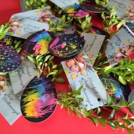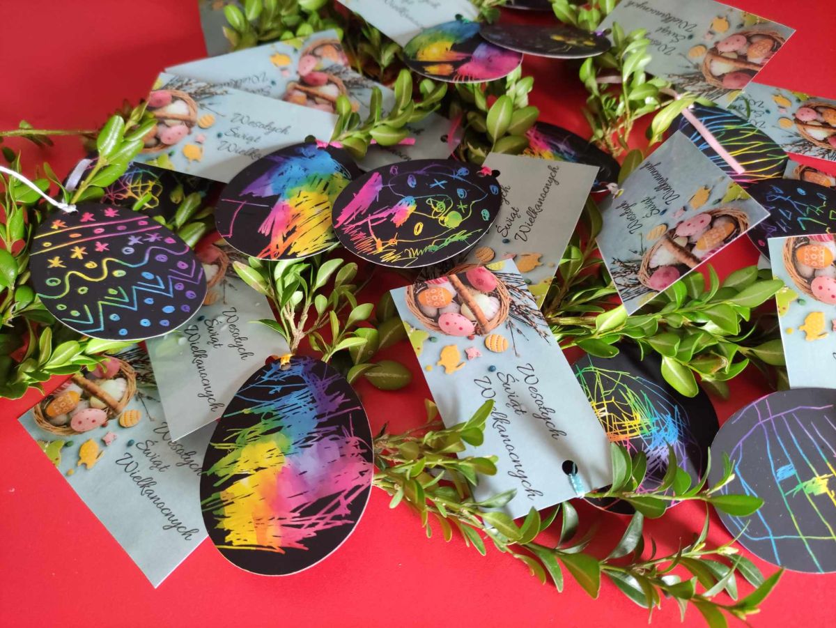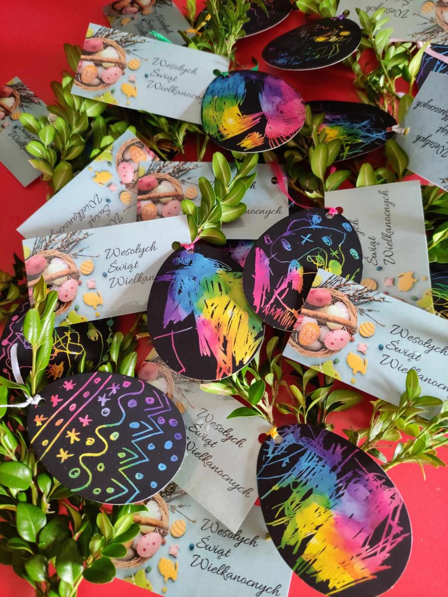 Maluszki w tygodniu poświęconym Wielkanocy wykonały również świąteczne upominki, które wręczyły wraz z życzeniami rodzicom. Dużo frajdy sprawiło dzieciom wydrapywanie wzorów na szablonie jaj.