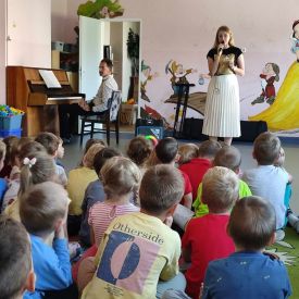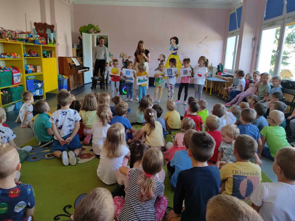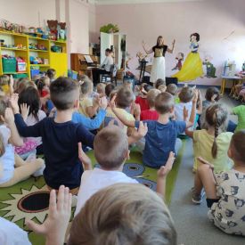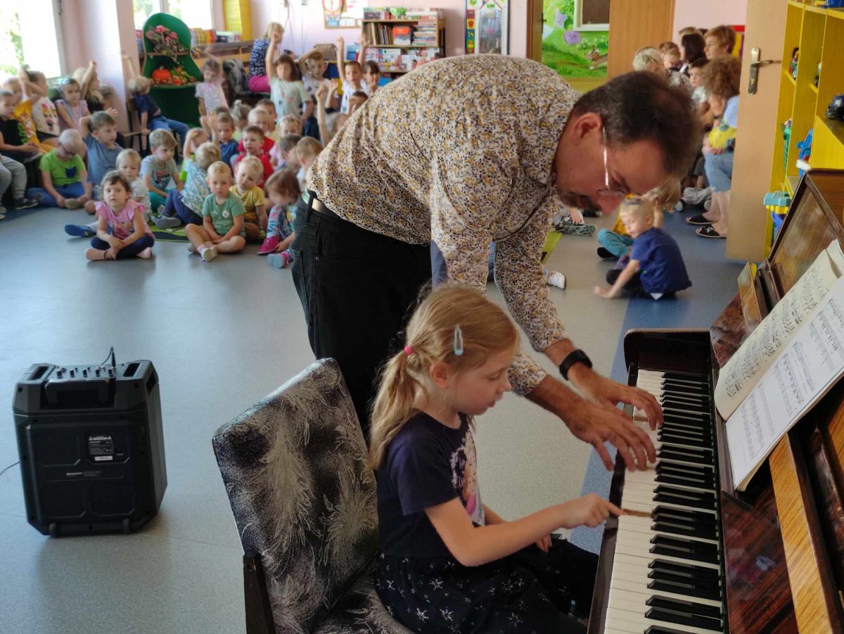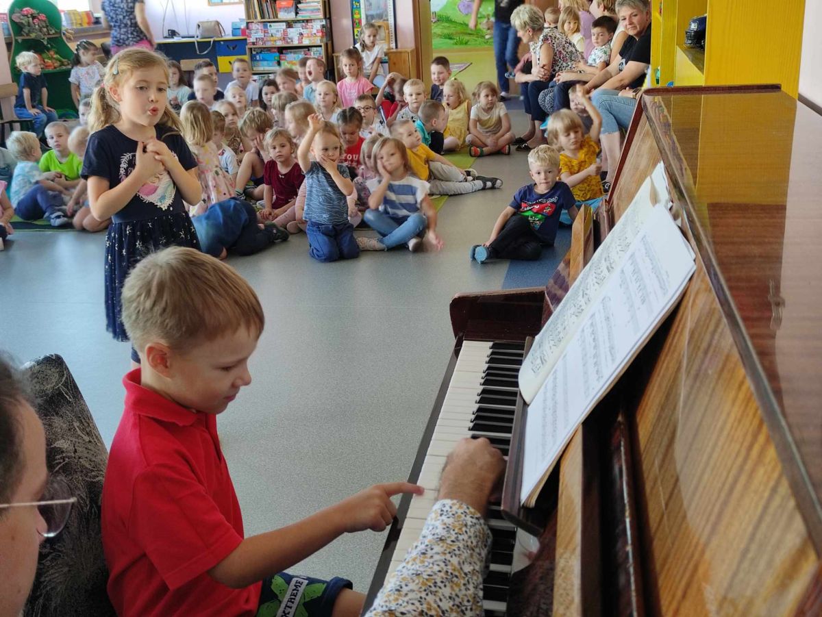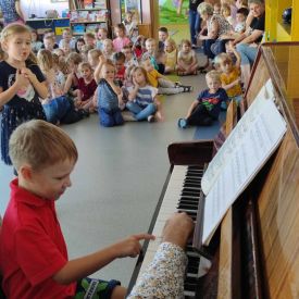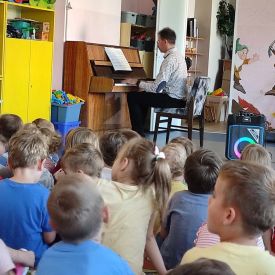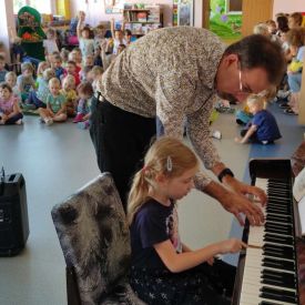 27 września rozpoczęliśmy cykl koncertów muzycznych we współpracy z Filharmonią Świętokrzyską. Podczas pierwszego koncertu przedszkolaki zostały zapoznane z muzyką Fryderyka Chopina. Zagrał dla dzieci niesamowity, czarodziejski instrument - PIANINO. Przedszkolaki zobaczyły ile dźwięków można zagrać na pianinie jednym palcem, niektórzy mieli okazję przekonać się o tym osobiście.