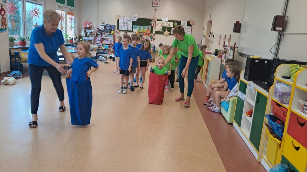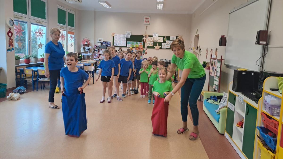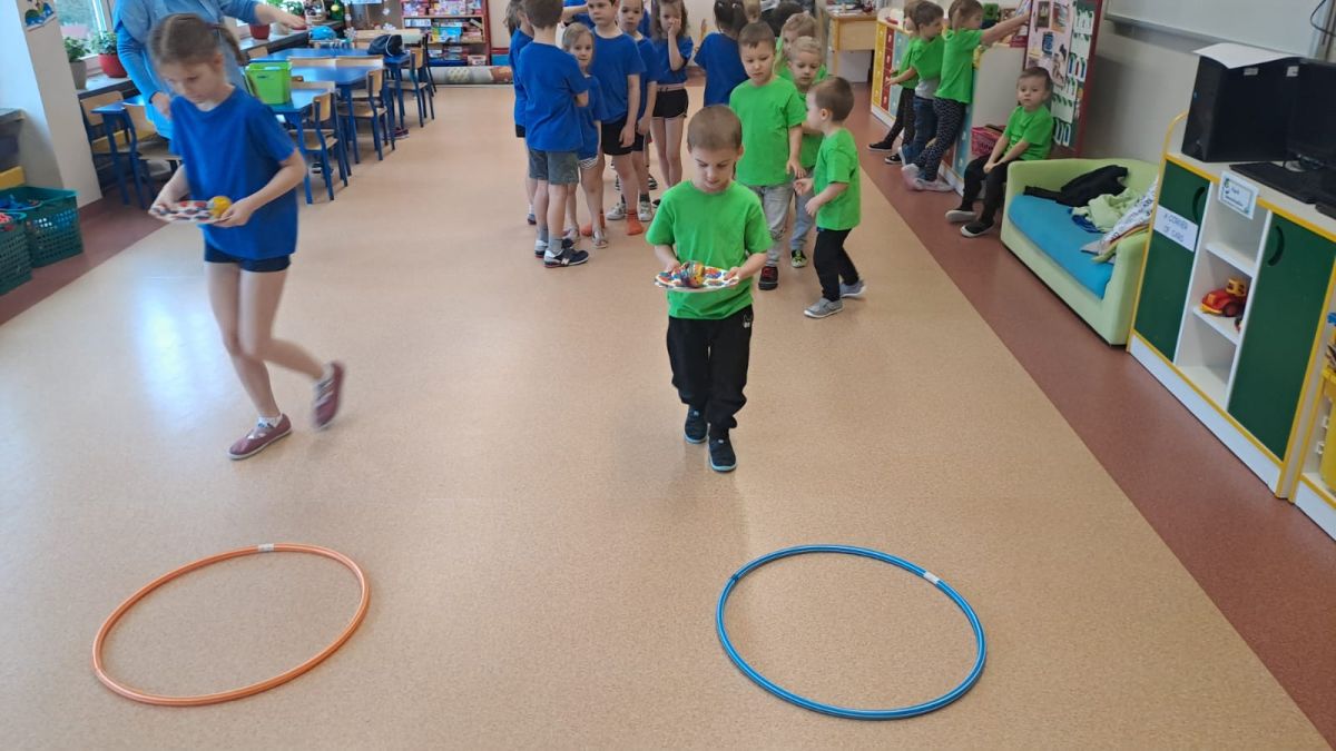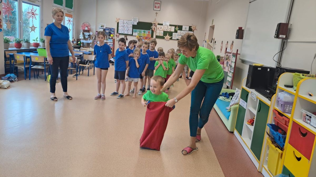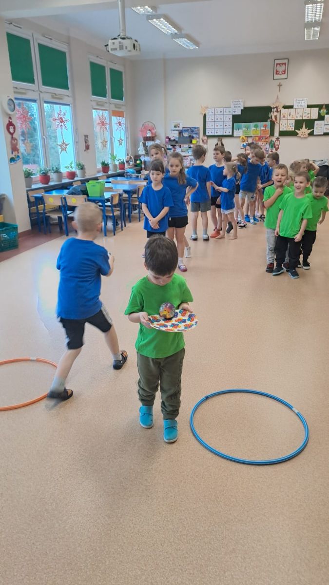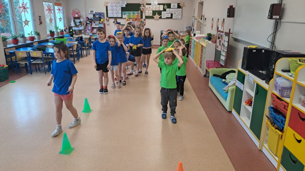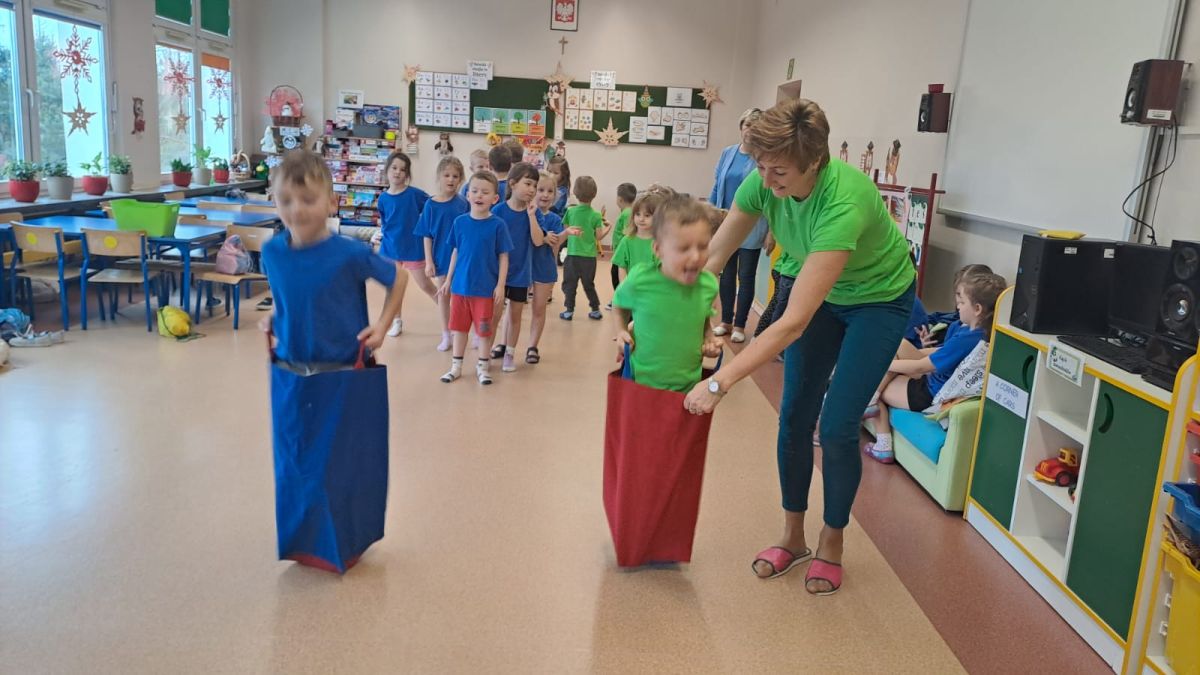 Dnia 26 stycznia 2024 r. dzieci z grupy „Żabek” i „Sówek” wzięły udział w zawodach sportowych pod hasłem „Kto pierwszy?”. Przedszkolaki rozpoczęły od rozgrzewki przy muzyce a następnie zostały podzielone na 2 drużyny. Dzieci rywalizowały w konkurencjach takich jak: slalom z woreczkiem na głowie, kto pierwszy podniesie woreczek, kto pierwszy stopami wrzuci woreczek do obręczy, budowanie wieży, bieg z piłką na talerzyku, skoki w workach. Celem zabaw było rozwijanie podstawowych form ruchu: biegu, skoku, chwytu oraz koordynacji wzrokowo-ruchowej oraz odporności emocjonalnej. Uwieńczeniem zawodów były ćwiczenia relaksacyjne „Zimowa joga”, które pomogły dzieciom uspokoić się i wyciszyć po intensywnej aktywności fizycznej.