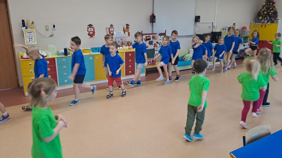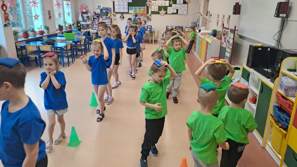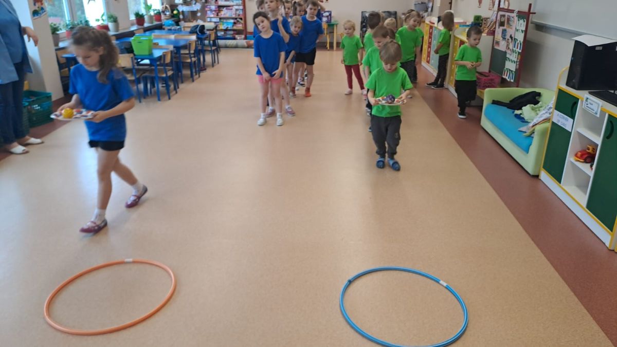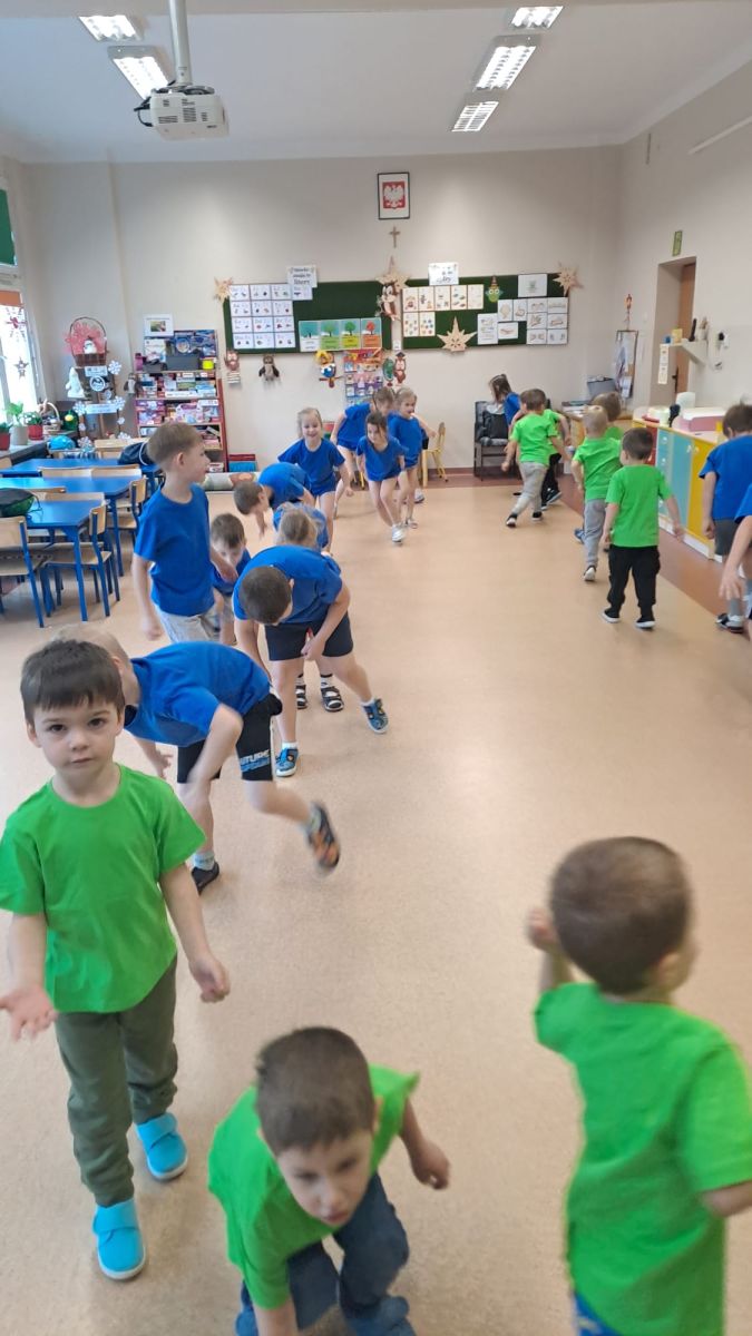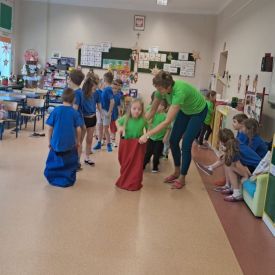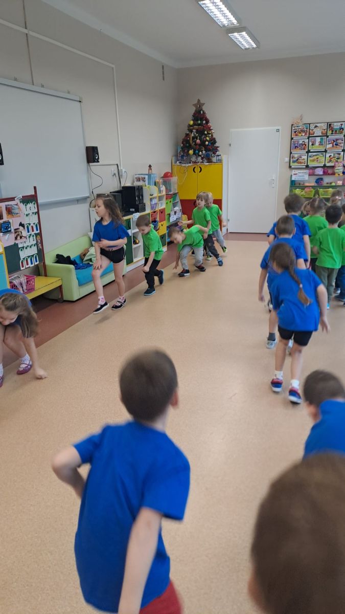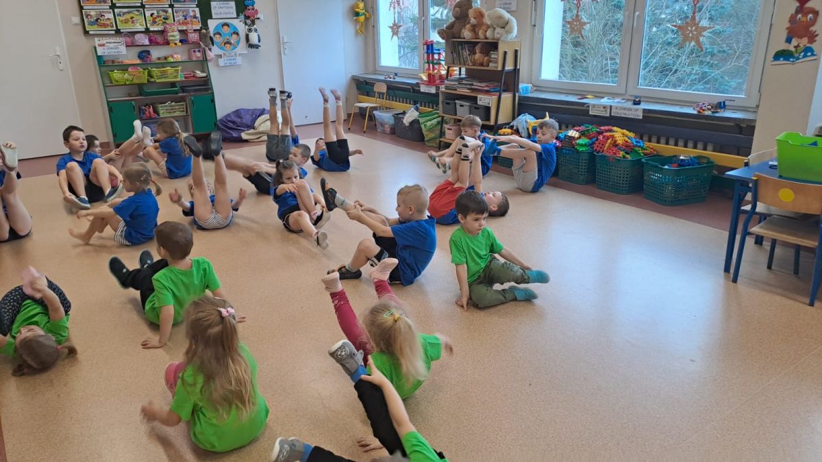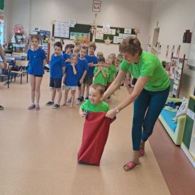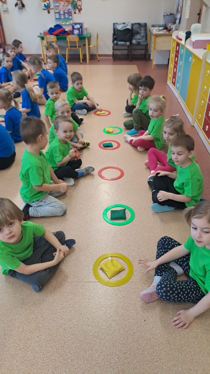 Dnia 26 stycznia 2024 r. dzieci z grupy „Żabek” i „Sówek” wzięły udział w zawodach sportowych pod hasłem „Kto pierwszy?”. Przedszkolaki rozpoczęły od rozgrzewki przy muzyce a następnie zostały podzielone na 2 drużyny. Dzieci rywalizowały w konkurencjach takich jak: slalom z woreczkiem na głowie, kto pierwszy podniesie woreczek, kto pierwszy stopami wrzuci woreczek do obręczy, budowanie wieży, bieg z piłką na talerzyku, skoki w workach. Celem zabaw było rozwijanie podstawowych form ruchu: biegu, skoku, chwytu oraz koordynacji wzrokowo-ruchowej oraz odporności emocjonalnej. Uwieńczeniem zawodów były ćwiczenia relaksacyjne „Zimowa joga”, które pomogły dzieciom uspokoić się i wyciszyć po intensywnej aktywności fizycznej.