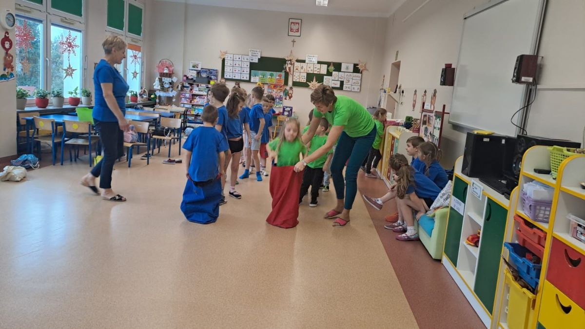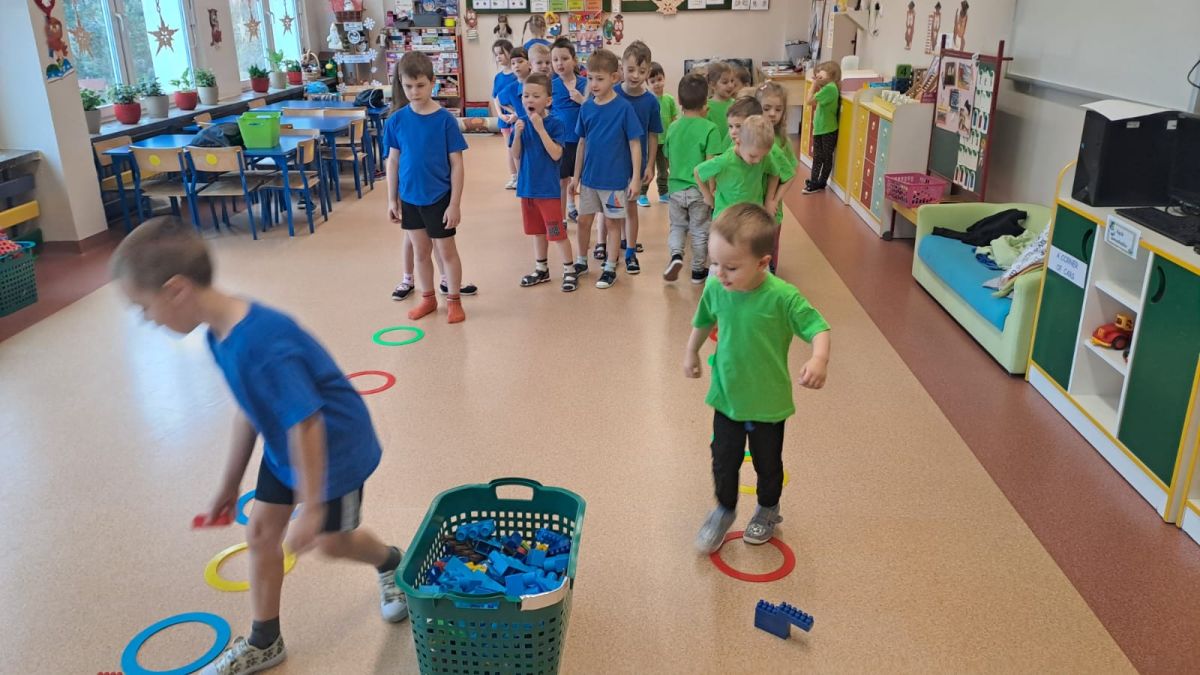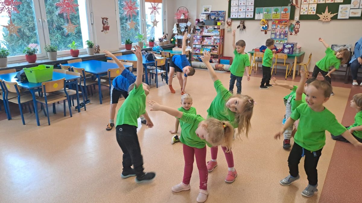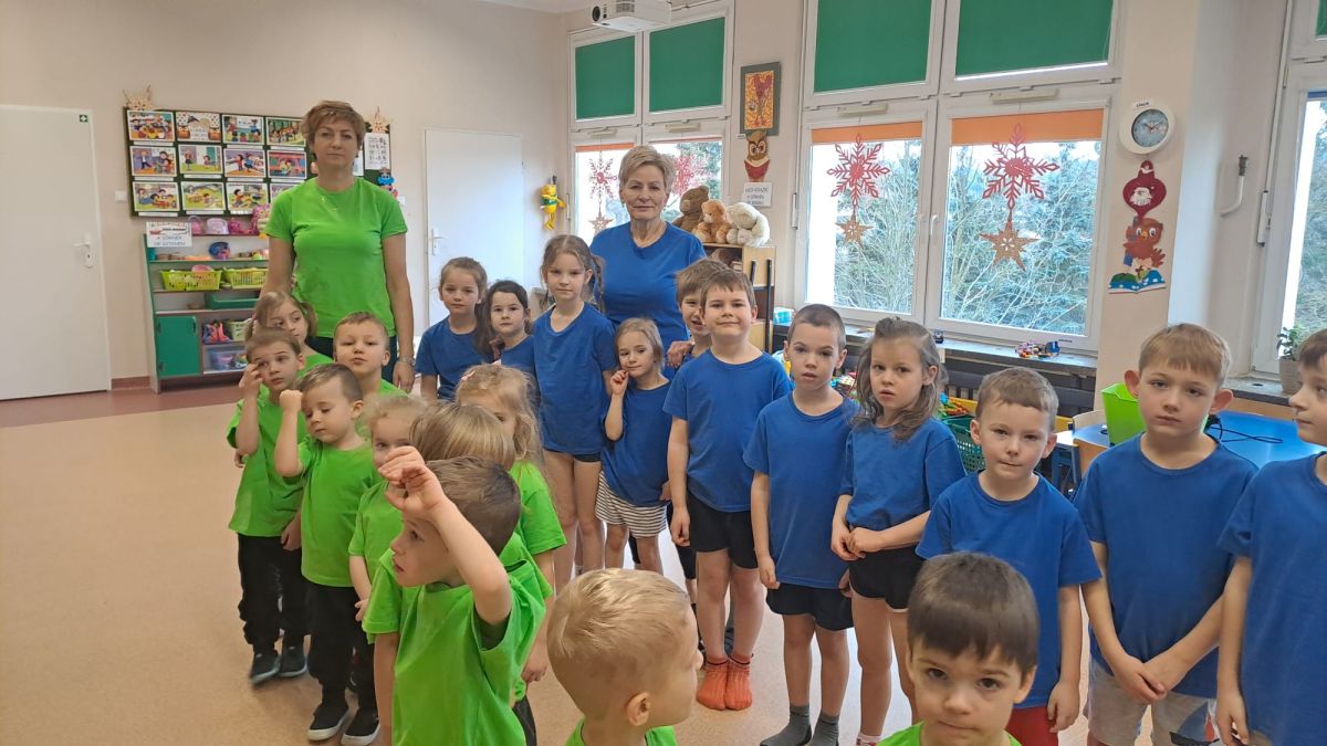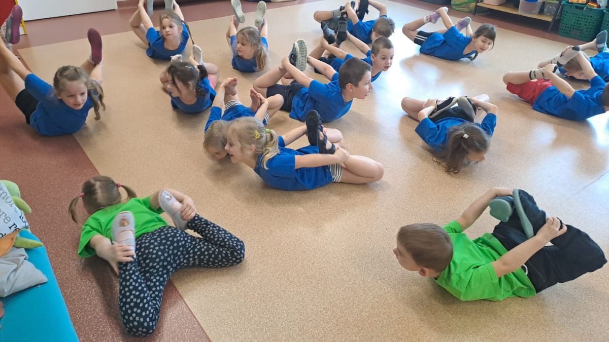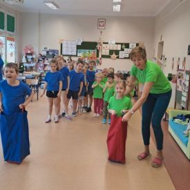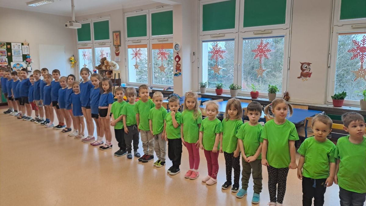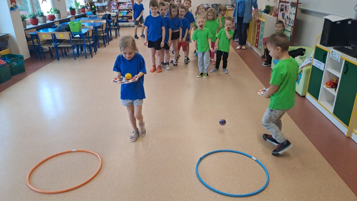 Dnia 26 stycznia 2024 r. dzieci z grupy „Żabek” i „Sówek” wzięły udział w zawodach sportowych pod hasłem „Kto pierwszy?”. Przedszkolaki rozpoczęły od rozgrzewki przy muzyce a następnie zostały podzielone na 2 drużyny. Dzieci rywalizowały w konkurencjach takich jak: slalom z woreczkiem na głowie, kto pierwszy podniesie woreczek, kto pierwszy stopami wrzuci woreczek do obręczy, budowanie wieży, bieg z piłką na talerzyku, skoki w workach. Celem zabaw było rozwijanie podstawowych form ruchu: biegu, skoku, chwytu oraz koordynacji wzrokowo-ruchowej oraz odporności emocjonalnej. Uwieńczeniem zawodów były ćwiczenia relaksacyjne „Zimowa joga”, które pomogły dzieciom uspokoić się i wyciszyć po intensywnej aktywności fizycznej.