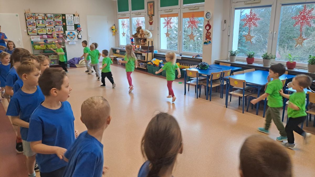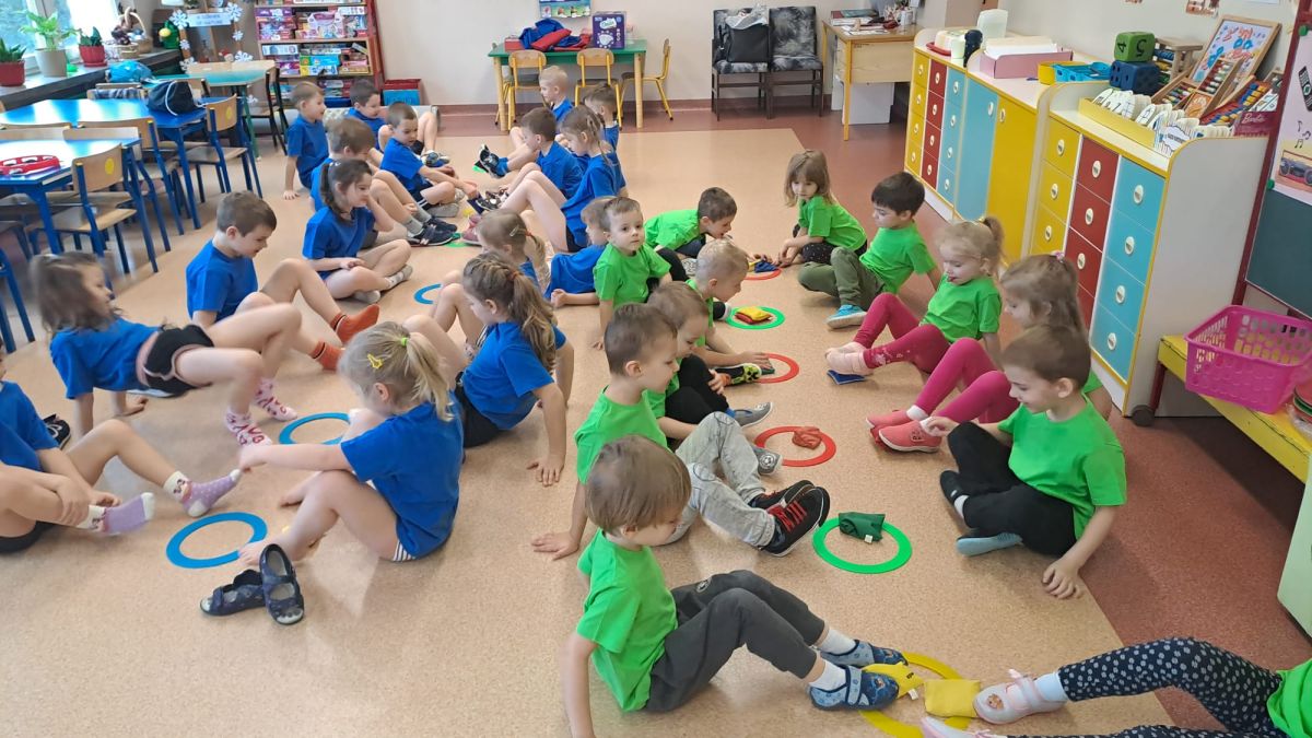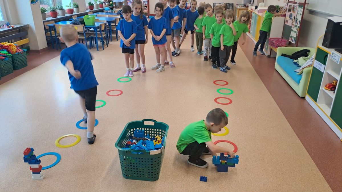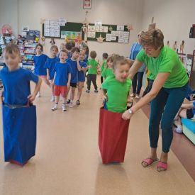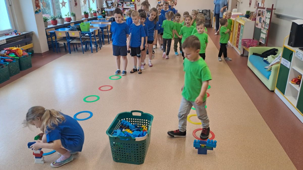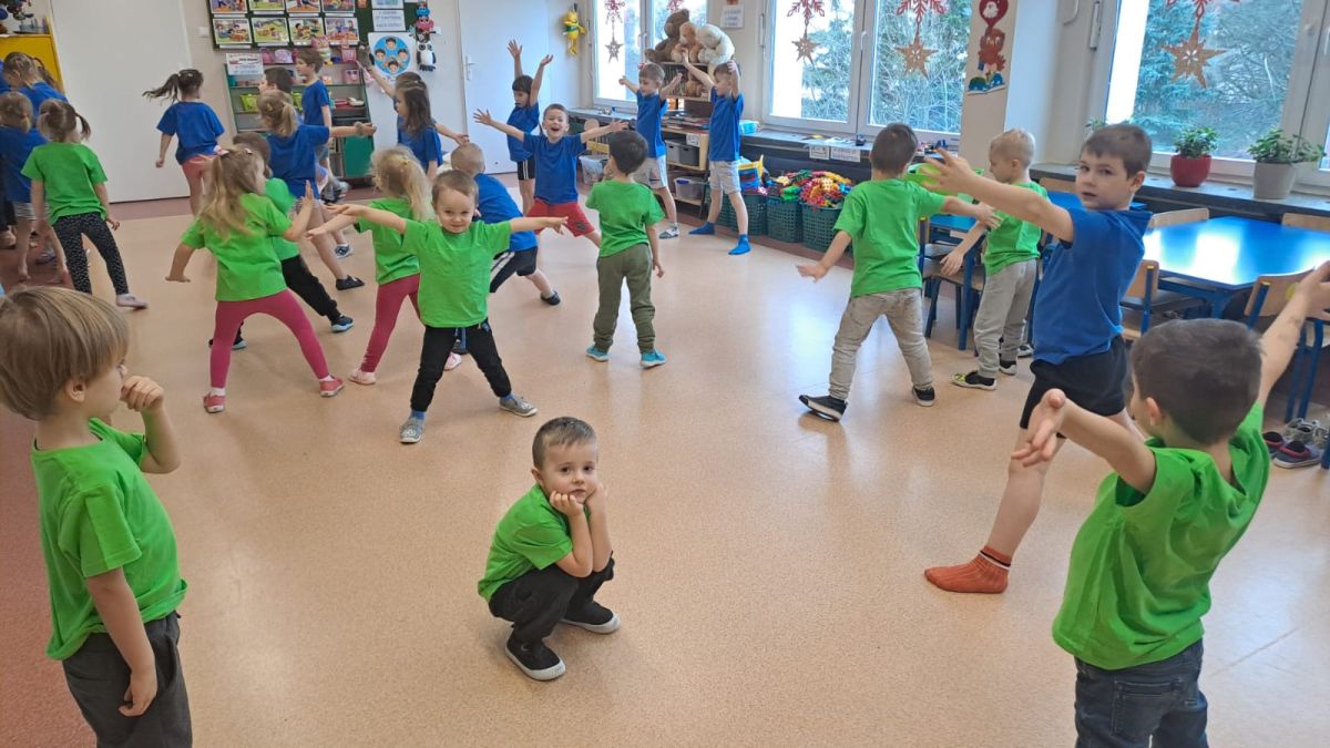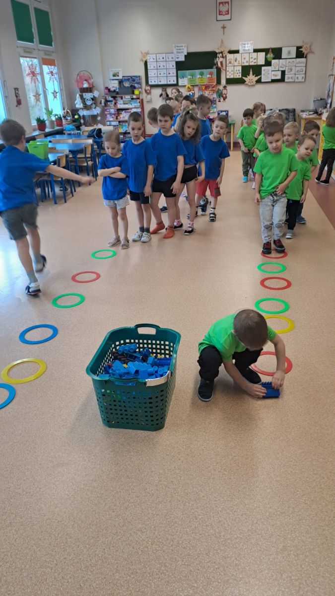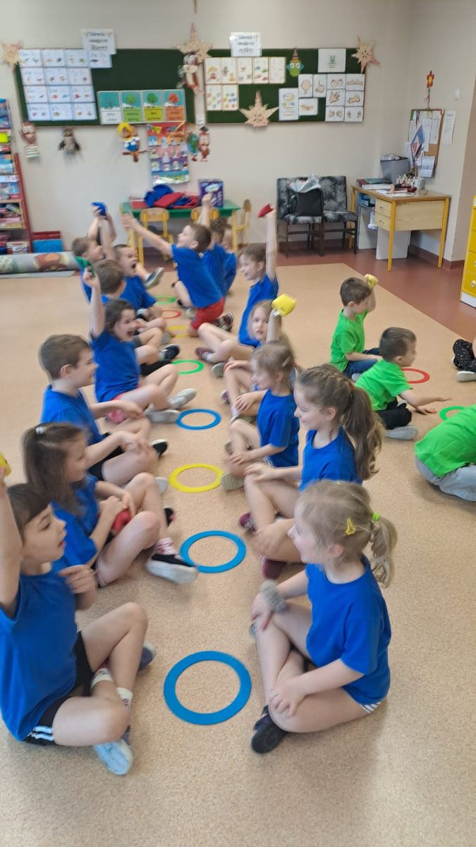 Dnia 26 stycznia 2024 r. dzieci z grupy „Żabek” i „Sówek” wzięły udział w zawodach sportowych pod hasłem „Kto pierwszy?”. Przedszkolaki rozpoczęły od rozgrzewki przy muzyce a następnie zostały podzielone na 2 drużyny. Dzieci rywalizowały w konkurencjach takich jak: slalom z woreczkiem na głowie, kto pierwszy podniesie woreczek, kto pierwszy stopami wrzuci woreczek do obręczy, budowanie wieży, bieg z piłką na talerzyku, skoki w workach. Celem zabaw było rozwijanie podstawowych form ruchu: biegu, skoku, chwytu oraz koordynacji wzrokowo-ruchowej oraz odporności emocjonalnej. Uwieńczeniem zawodów były ćwiczenia relaksacyjne „Zimowa joga”, które pomogły dzieciom uspokoić się i wyciszyć po intensywnej aktywności fizycznej.