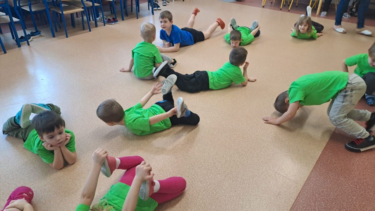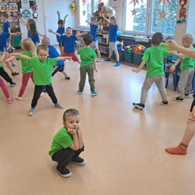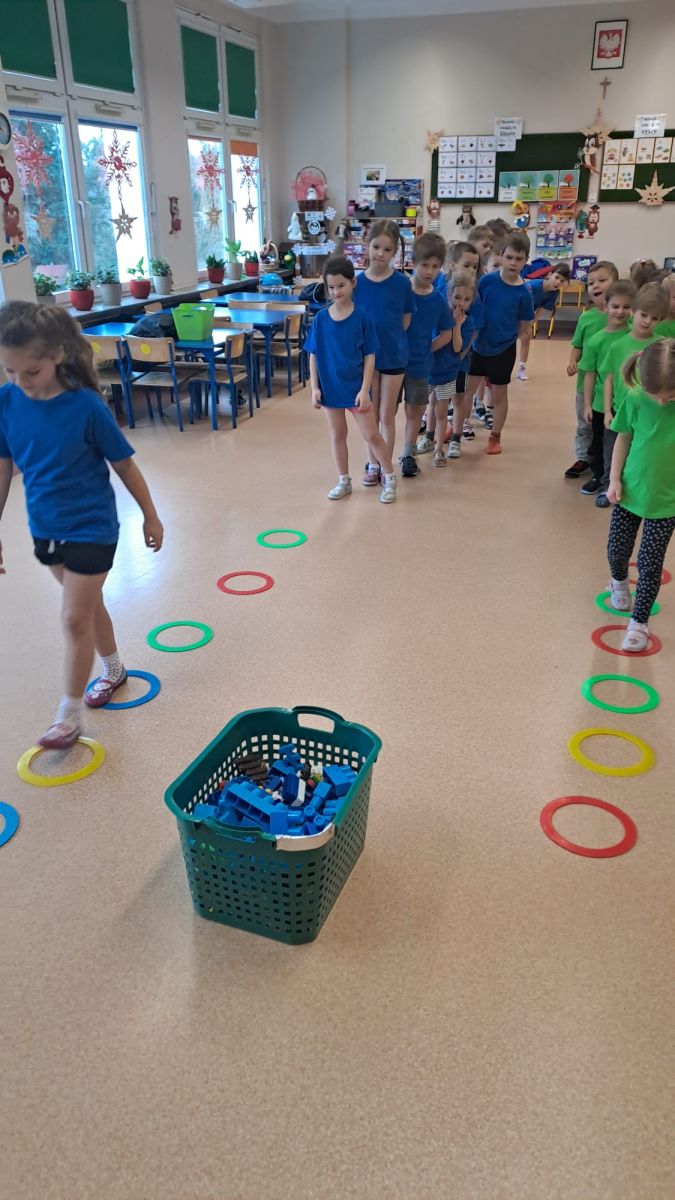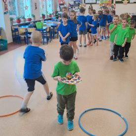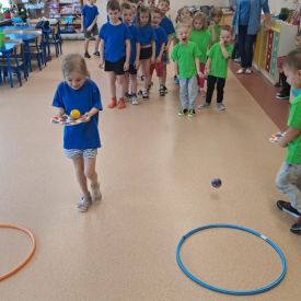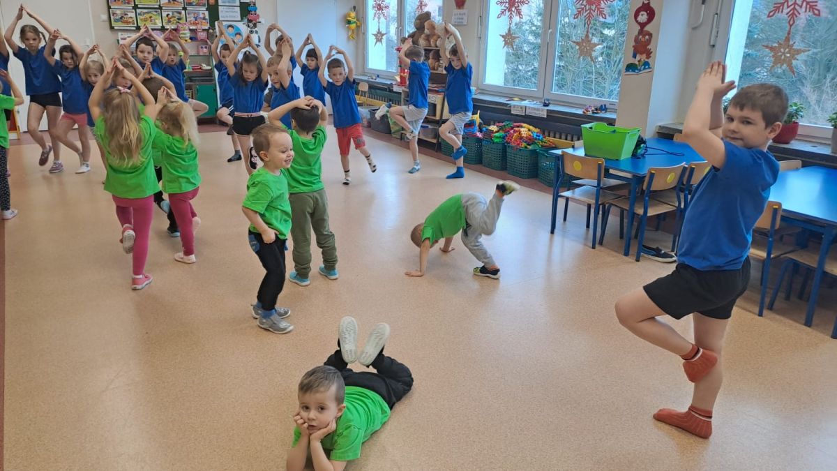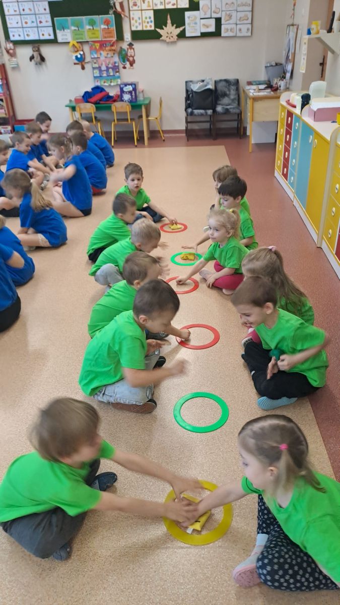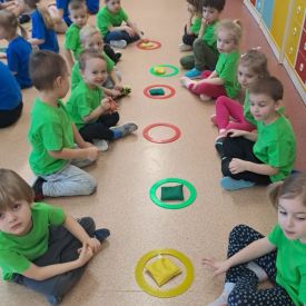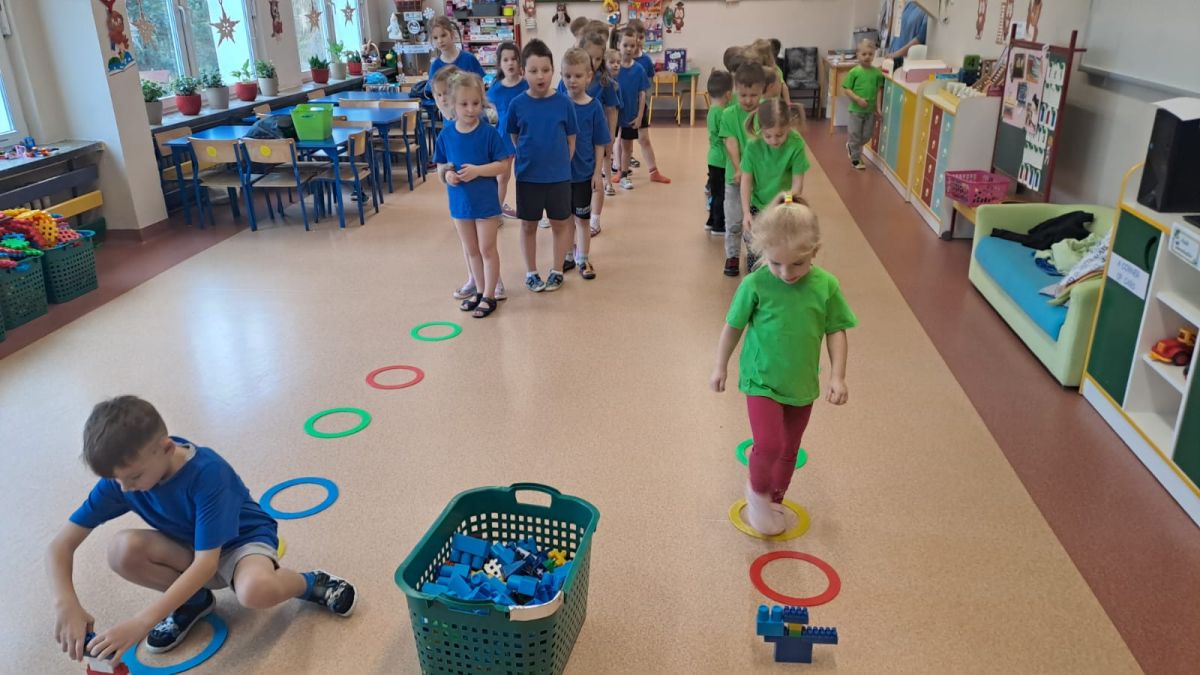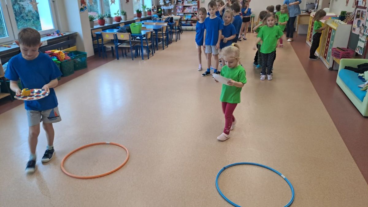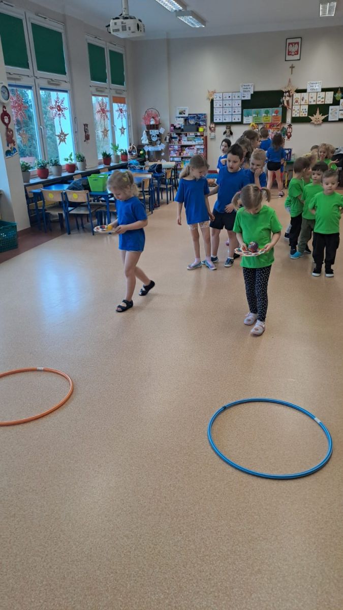 Dnia 26 stycznia 2024 r. dzieci z grupy „Żabek” i „Sówek” wzięły udział w zawodach sportowych pod hasłem „Kto pierwszy?”. Przedszkolaki rozpoczęły od rozgrzewki przy muzyce a następnie zostały podzielone na 2 drużyny. Dzieci rywalizowały w konkurencjach takich jak: slalom z woreczkiem na głowie, kto pierwszy podniesie woreczek, kto pierwszy stopami wrzuci woreczek do obręczy, budowanie wieży, bieg z piłką na talerzyku, skoki w workach. Celem zabaw było rozwijanie podstawowych form ruchu: biegu, skoku, chwytu oraz koordynacji wzrokowo-ruchowej oraz odporności emocjonalnej. Uwieńczeniem zawodów były ćwiczenia relaksacyjne „Zimowa joga”, które pomogły dzieciom uspokoić się i wyciszyć po intensywnej aktywności fizycznej.