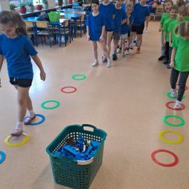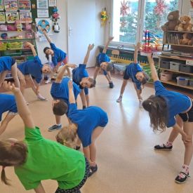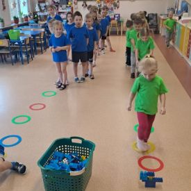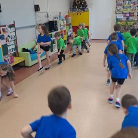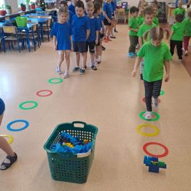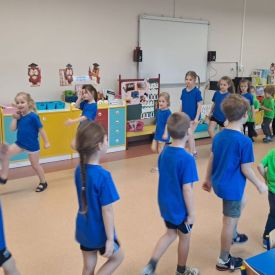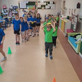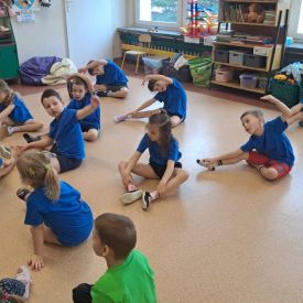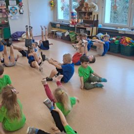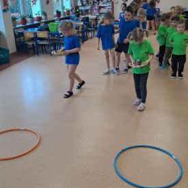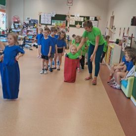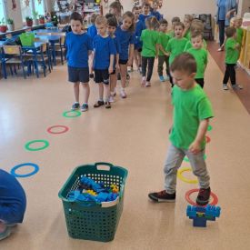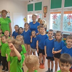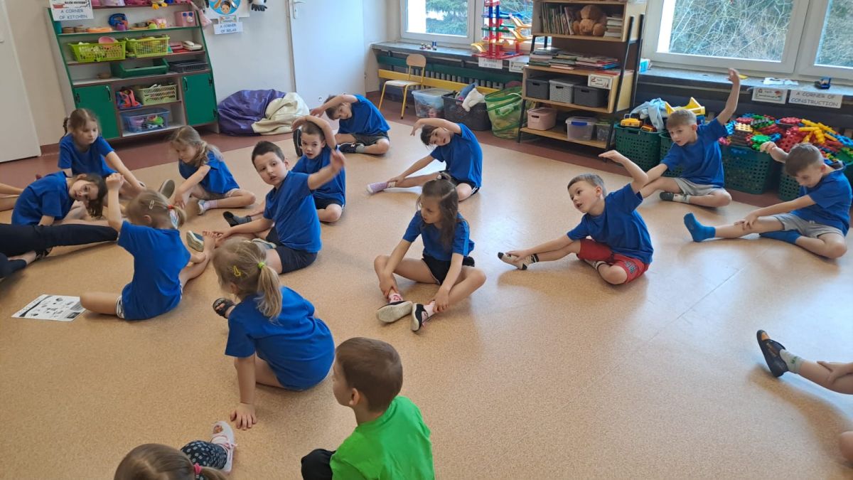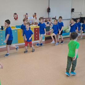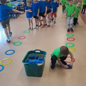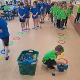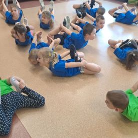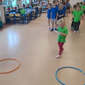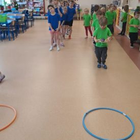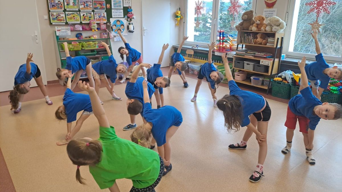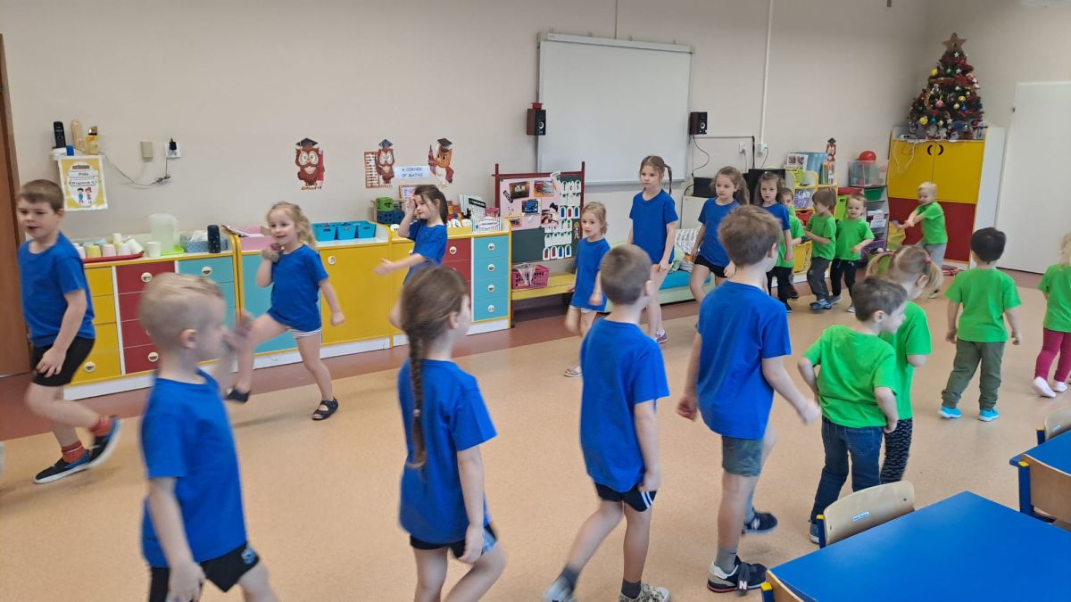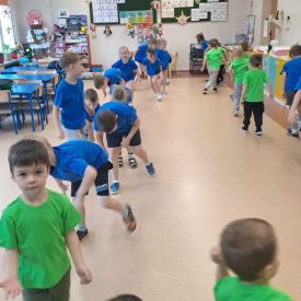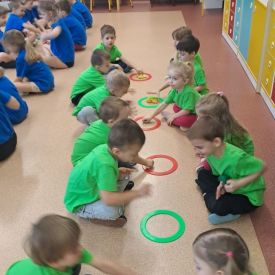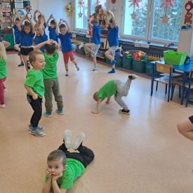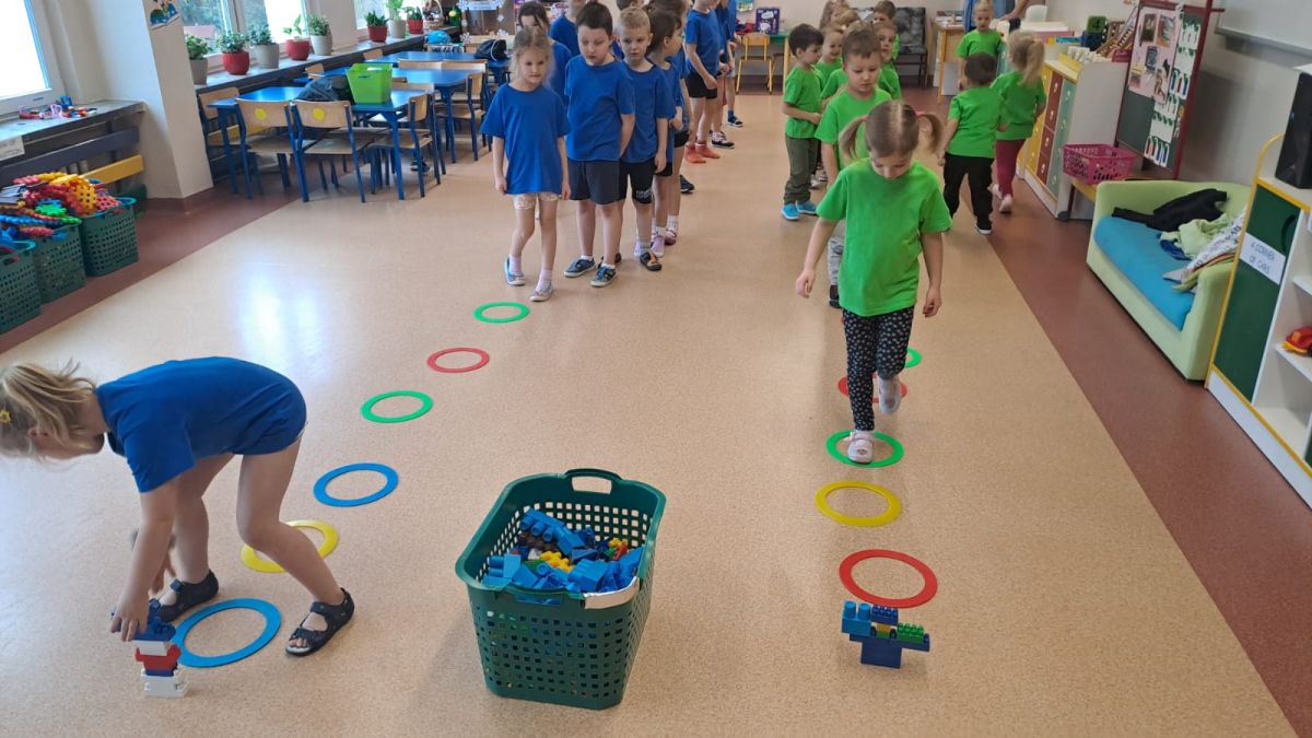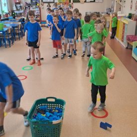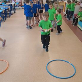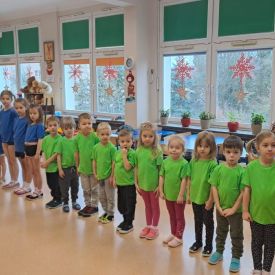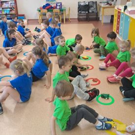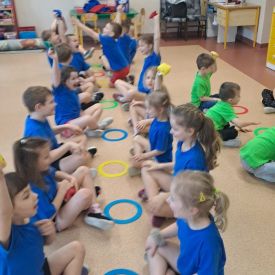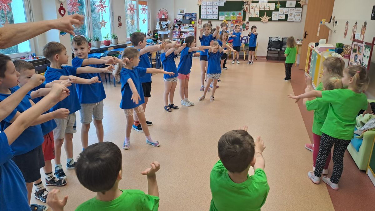 Dnia 26 stycznia 2024 r. dzieci z grupy „Żabek” i „Sówek” wzięły udział w zawodach sportowych pod hasłem „Kto pierwszy?”. Przedszkolaki rozpoczęły od rozgrzewki przy muzyce a następnie zostały podzielone na 2 drużyny. Dzieci rywalizowały w konkurencjach takich jak: slalom z woreczkiem na głowie, kto pierwszy podniesie woreczek, kto pierwszy stopami wrzuci woreczek do obręczy, budowanie wieży, bieg z piłką na talerzyku, skoki w workach. Celem zabaw było rozwijanie podstawowych form ruchu: biegu, skoku, chwytu oraz koordynacji wzrokowo-ruchowej oraz odporności emocjonalnej. Uwieńczeniem zawodów były ćwiczenia relaksacyjne „Zimowa joga”, które pomogły dzieciom uspokoić się i wyciszyć po intensywnej aktywności fizycznej.