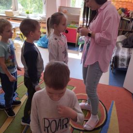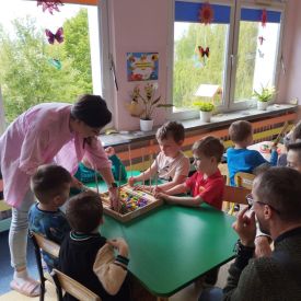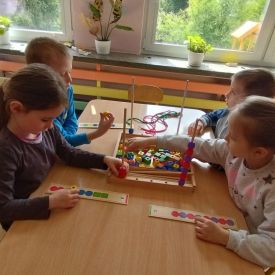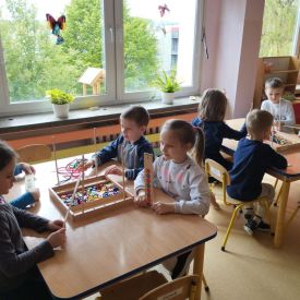 Dzieci z grupy Pszczółek zrealizowały dziewiąte zajęcia z Ogólnopolskiego projektu grantowego „Rosnę z matematyką”. Temat naszych zajęć to - sensoryczna matematyka. Pszczółki wykonywały różne ćwiczenia i zadania które pomogły im rozpoznawać i stosować podstawowe normy sensoryczne dotyczące koloru, kształtu i wielkości. Ćwiczenia te miały na celu zaangażowanie zmysłu dotyku do nauki matematyki. Dzieci wykonywały obliczenia na mące, nawlekały koraliki według podanego kodu, domalowywały paluszkiem zamoczonym w farbie odpowiednią liczbę brzuszków gąsiennicy oraz uczestniczyły w zabawach ruchowych. Zajęcia otwarte dla rodziców przyczyniły się do wzmacniania więzi rodzinnych. Bardzo dziękujemy za obecność.