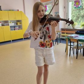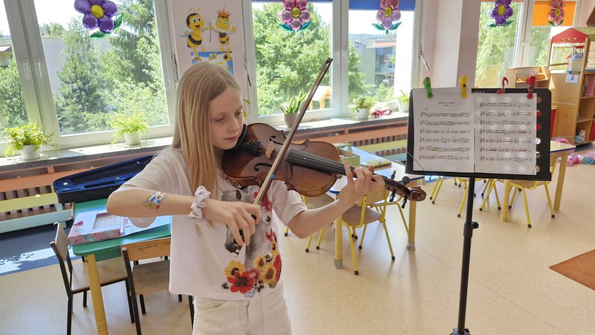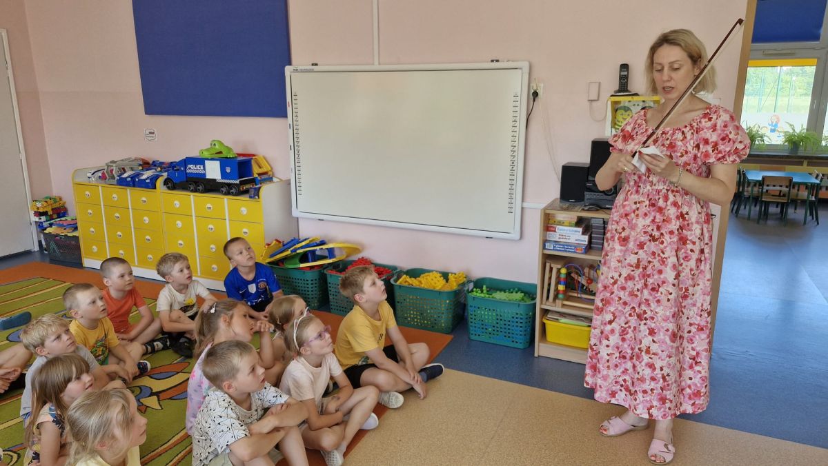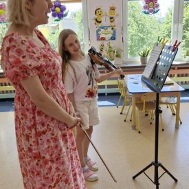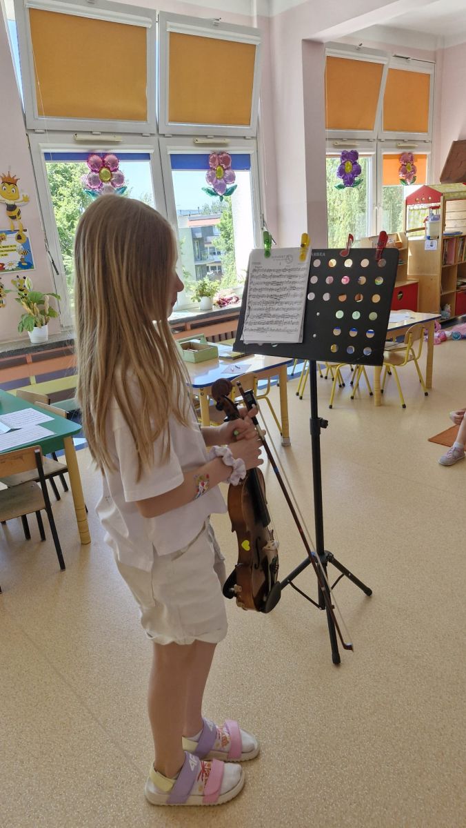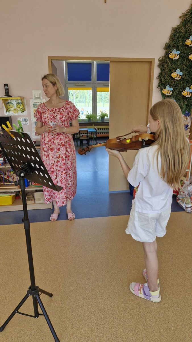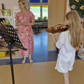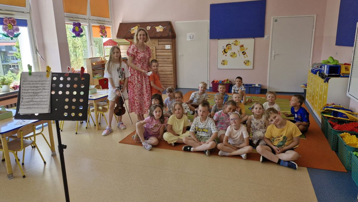 Na zakończenie roku szkolnego w ostatni dzień pobytu dzieci w przedszkolu odbył się ,,Pożegnalny koncert''. Uczennica klasy III Zespołu Państwowych Szkół Muzycznych im. L. Różyckiego w Kielcach zaprezentowała kilka utworów na skrzypcach. Dzieci z wielkim zainteresowaniem słuchały pięknej muzyki oraz zapoznały się z nowym instrumentem, o którym opowiedziała pani Monika. To był wspaniały dzień. W radosnych nastrojach rozstaliśmy się wszyscy na wakacje.
