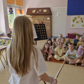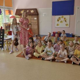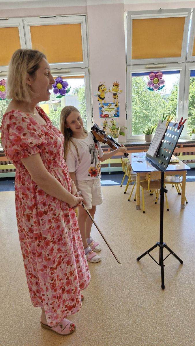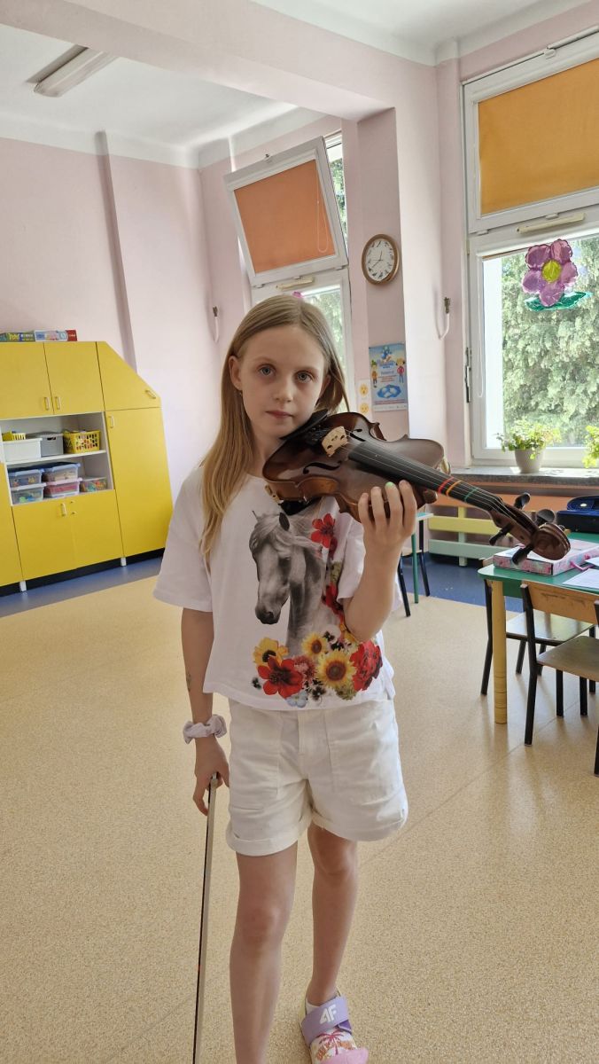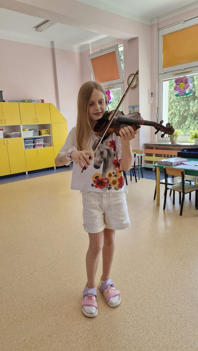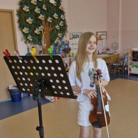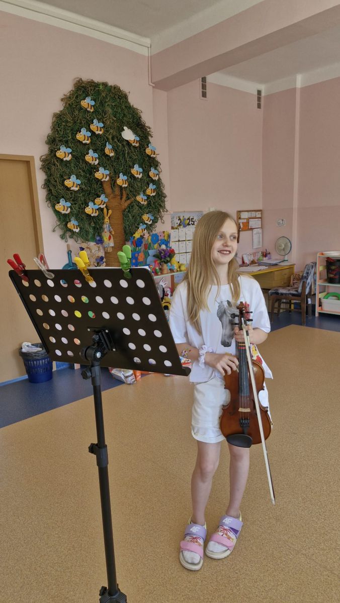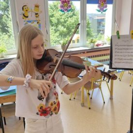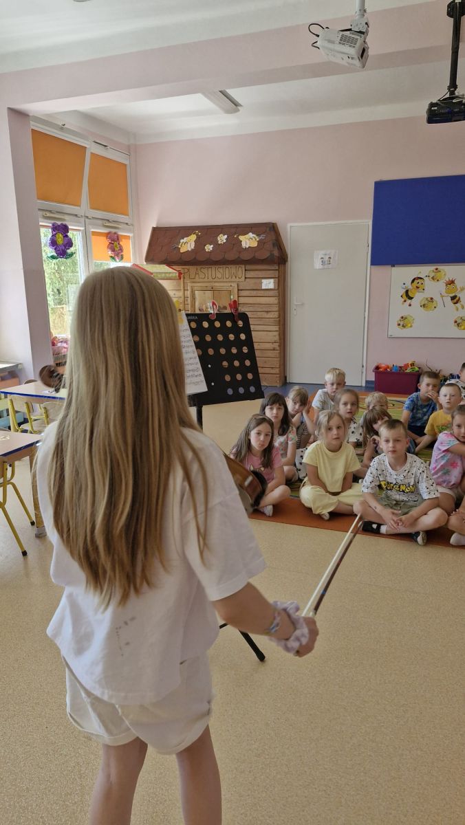 Na zakończenie roku szkolnego w ostatni dzień pobytu dzieci w przedszkolu odbył się ,,Pożegnalny koncert''. Uczennica klasy III Zespołu Państwowych Szkół Muzycznych im. L. Różyckiego w Kielcach zaprezentowała kilka utworów na skrzypcach. Dzieci z wielkim zainteresowaniem słuchały pięknej muzyki oraz zapoznały się z nowym instrumentem, o którym opowiedziała pani Monika. To był wspaniały dzień. W radosnych nastrojach rozstaliśmy się wszyscy na wakacje.
