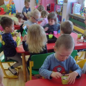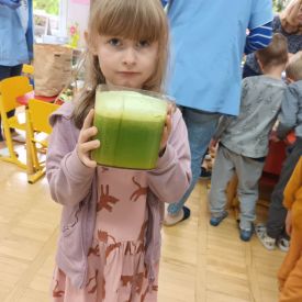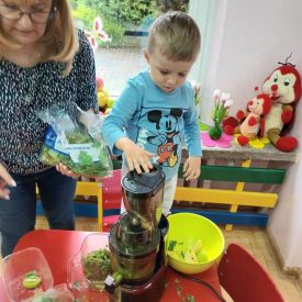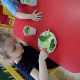 8. Przygotowały „zielony koktajl” z przyniesionych warzyw , w zabawie „Witaminy na talerzu” skomponowały zdrowy posiłek , który następnie z chęcią zjadły.