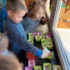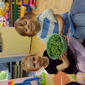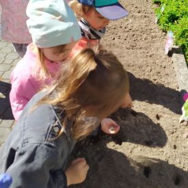 10. „Siejemy rzeżuchę”.- dzieci zasiały w pojemniczkach rzeżuchę, opiekowały się rośliną, obserwowały jej wzrost, poznały jej wartości odżywcze i walory smakowe. Zasiały warzywa w przedszkolnym gazonie- z zaciekawieniem przyglądały się wzrostowi roślin, z chęcią podlewały przedszkolny ogródek.