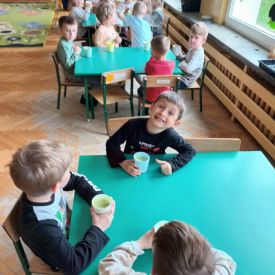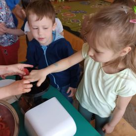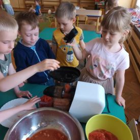 11.Podczas zajęć „Pomidor nie jedno ma imię.” Poznały wartości odżywcze pomidora oraz jego odmiany, wykonały i wypiły sok z pomidorów. Wykonały i skonsumowały zdrową przekąskę- koreczki z pomidorkacherry, szpinaku i serka mozzarella.