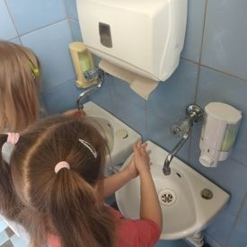 6. „Czystość i zdrowie”- rozmawiały na temat zasad higieny podczas przygotowywania i spożywania posiłków na podstawie wiersza „Rady Krzysia” (wykorzystanie wiersza z programu). Zapoznały się ze sposobem skutecznego mycia rąk.